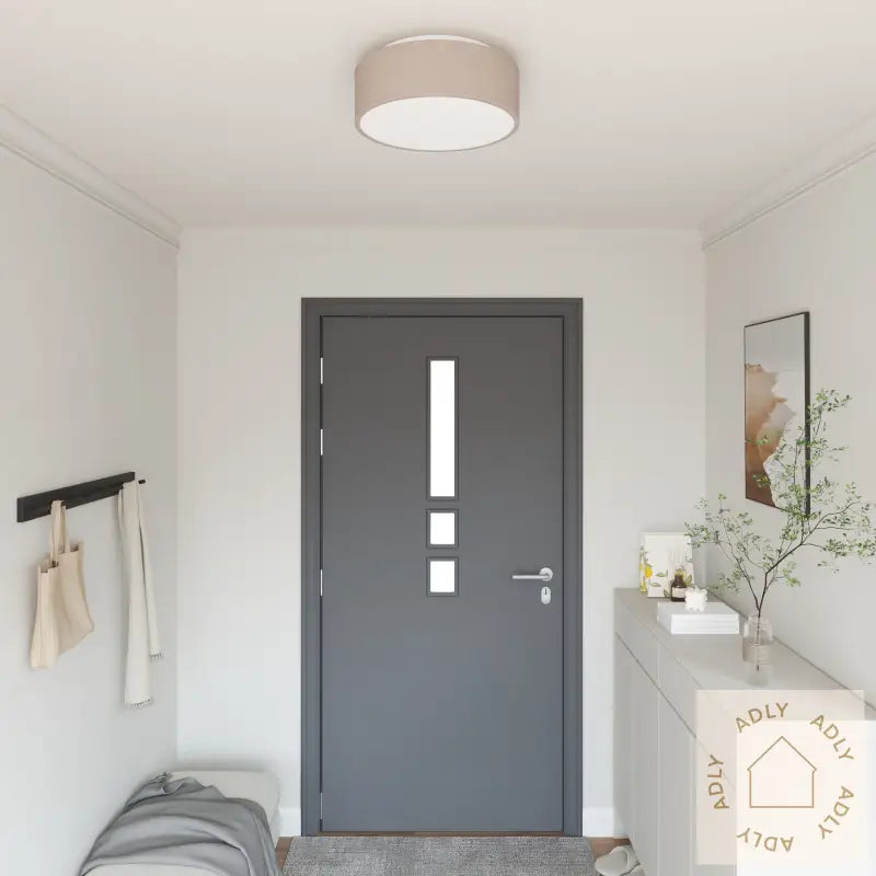 Taklampe med moderne design og myk belysning i gråbrun tekstilfinish