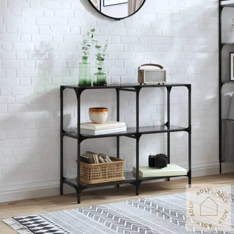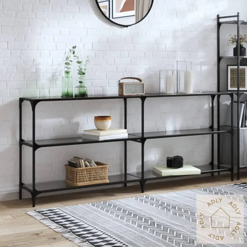 Stilrent sofabord med svart glass som passer til stående hyller