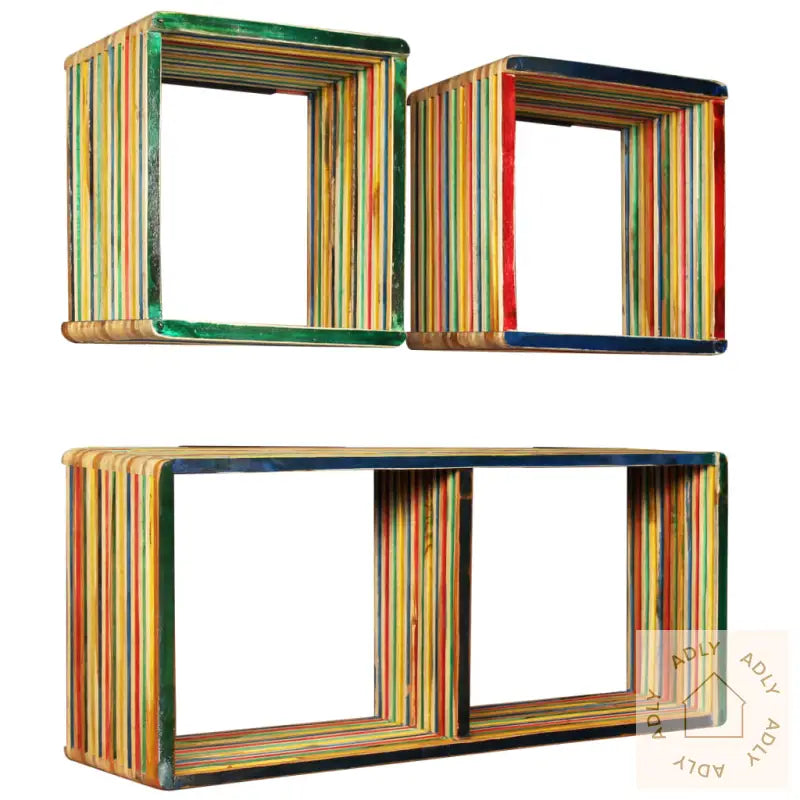 Fargerike vegghyller i gjenvunnet teak for smart lagring