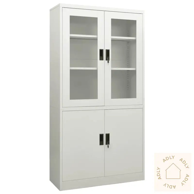 Oppbevaringsskap i stål med herdet glass og justerbare hyller
