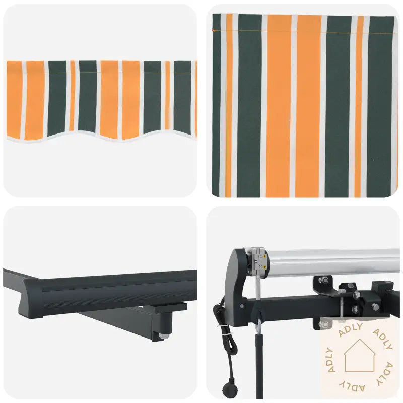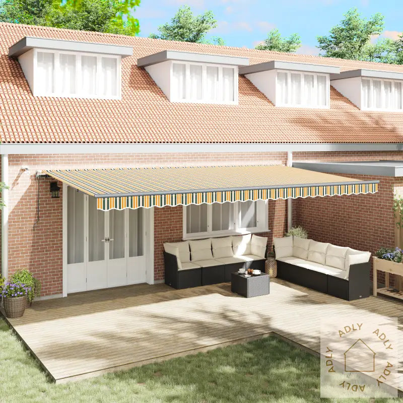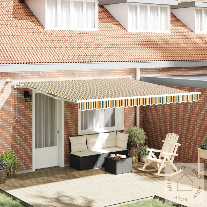 Automatisk uttrekkbar markise med stripete grønn og gul design