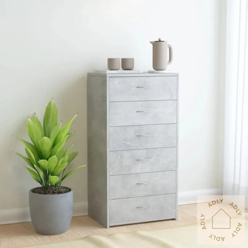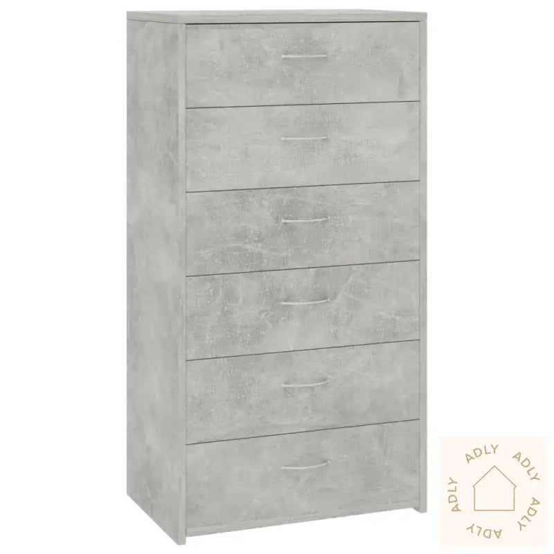Farge: betonggråMateriale: konstruert treSamlet mål: 50 x 34 x 96 cm (B x D x H)6 glattløpende skuffer med praktiske håndtakVennligst merk: Skruer og plugger for montering på vegg følger ikke med. Sørg for å bruke riktige skruer og plugger for nettopp dine vegger, og ta kontakt med fagfolk om nødvendig. Følg monteringsanvisningen nøye.