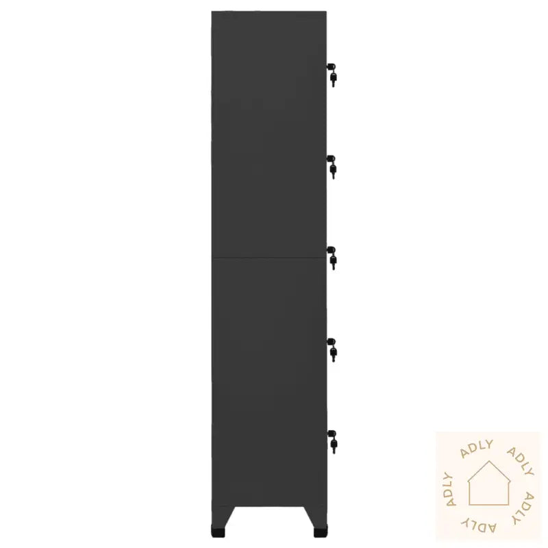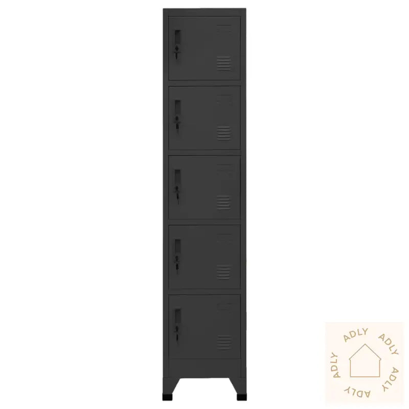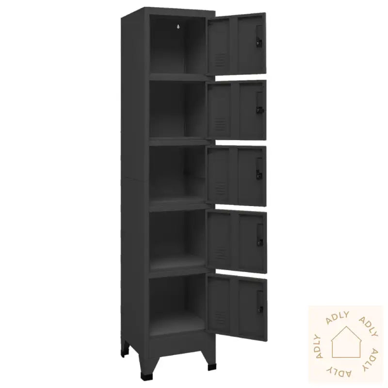 Farge: antrasittMateriale: stålMål: 38 x 40 x 180 cm (B x D x H)5 låsbare dører (2 nøkler inkludert for hver dør)Med luftventiler og navnelappholdere på dørerLastekapasitet per rom: 15 kgTotal lastekapasitet: 75 kgMontering kreves: jaADVARSEL: For å forhindre at produktet velter må de medfølgende festene for vegg brukes