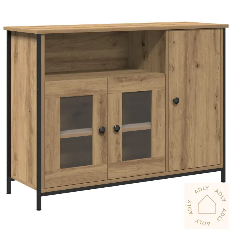 Elegant design: Med sin gjennomførte eikefinish bringer dette sidebordet varme og karakter til rommet, samtidig som de rene, rette linjene bidrar til et moderne preg. Det harmonerer uanstrengt med ulike stiler, enten du har klassisk, nordisk eller mer moderne interiør blant dine møbler.God plass til oppbevaring: De tre romslige glassdør-kompartmentene gir deg fleksibel lagringsplass – perfekt for porselen, bestikk eller vakre pyntegjenstander. Glasspanelene lar deg vise frem det du er ekstra stolt av, mens alt forblir oversiktlig og støvfritt.Kvalitetsmateriale: Sidebordet er bygget av slitesterkt konstruert tre, som sikrer stabilitet og lang levetid selv ved daglig bruk. Den solide teksturerte finishen holder utseendet på topp år etter år, og gjør dette til en investering i kvalitetsmøbler.Allsidig funksjonalitet: Ideell som buffét under familiemåltider eller større selskap, hvor mat og drikke alltid er lett tilgjengelig. Dette sidebordet kan også brukes som et dekorativt utstillingsskap eller som et blikkfang i for eksempel stue eller entre dersom du ønsker å variere hvor du har bordet. Lik flere bokhyller og stående hyller gir det praktisk lagringsplass og ekstra muligheter for personlig preg blant møbler til hjemmet.Plassbesparende design: Sidebordets kompakte og arealeffektive utforming gjør at det passer selv i mindre rom, uten at det stjeler unødig plass. Dermed får du glede av både funksjon og estetikk, også om du har behov for smarte løsninger i hjemmet ditt.Farge: EikForm: RektangulærMateriale: Konstruert treFinish: TeksturertInnendørs/Utendørs: Kun innendørsAntall dører: 3Cover inkludert: NeiRom: SpisestueOverflate høyde: 2 cmBens høyde: 10 cmSvings: NeiMerke: Leveranse inneholder: SidebordMontering kreves: JaAnbefalt antall personer for montering: 2