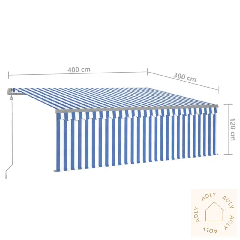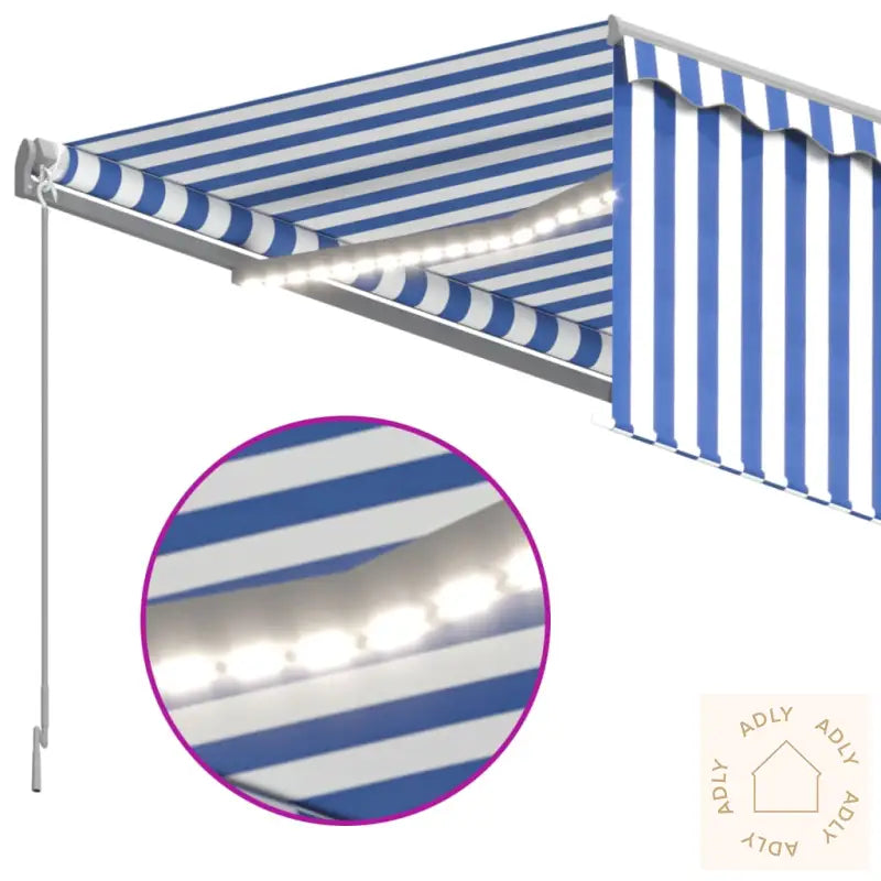 Farger: blå og hvitFarge ramme: antrasittMaterialer: pulverlakkert aluminium, 100% polyesterstoff med PU-beleggMål markise: 4 x 3 m (B x H)Mål rullegardin: 4 x 1,2 m (B x H)Spenning: 230V~ , 0,68A; 50/60 HzEffekt: 155 WMoment: 20 NmHastighet: 13 rpmLED-spenning: 12 VMontering kreves: ja