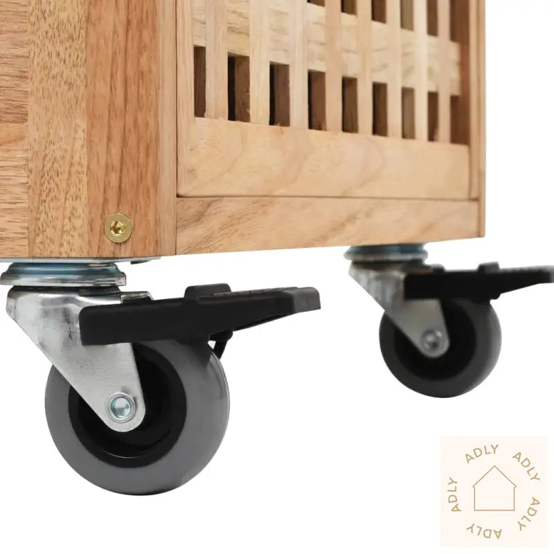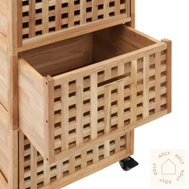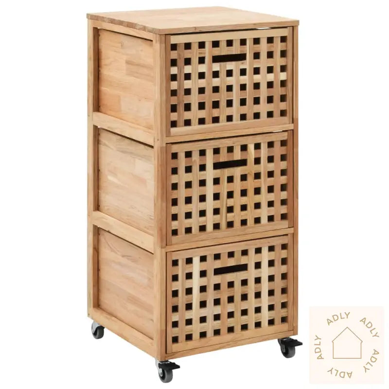 Baderomsskapet har tre romslige kurver som gir god plass til organisering av håndklær, vaskekluter, hygieneprodukter og andre nødvendigheter. Kurvenes gitterdesign sørger for luftsirkulasjon og holder innholdet friskt over tid. Skapet er laget av slitesterkt heltre valnøtt og kryssfinér, som sikrer lang levetid og et eksklusivt preg. Praktiske hjul gjør det enkelt å flytte skapet akkurat dit du trenger det – enten du ommøblerer, pusser opp, eller bare vil bytte plass på møbler.