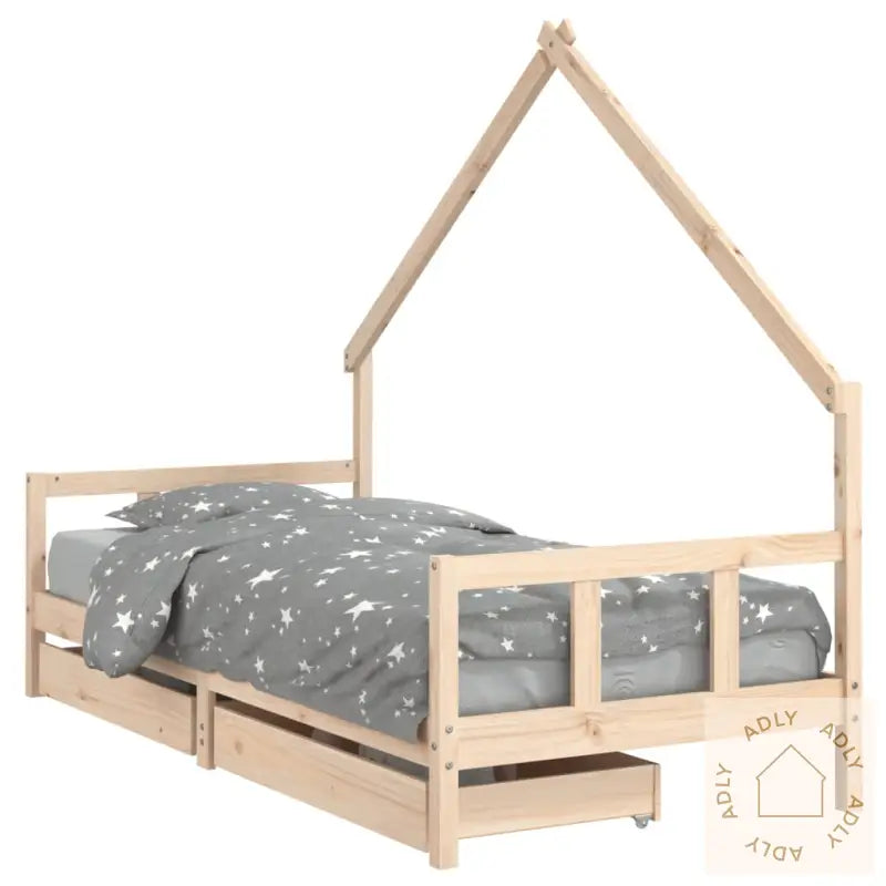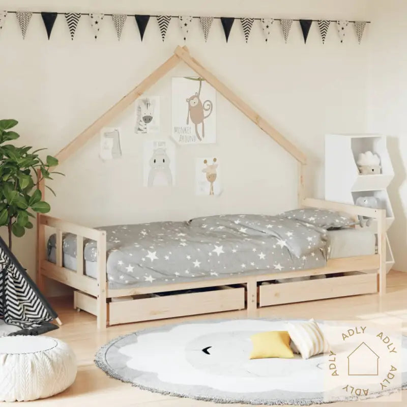 Heltre furu: Barnesengerammen er laget av robust heltre furu – et slitesterkt og miljøvennlig naturmateriale. Den naturlige strukturen, de rette årringene og de karakteristiske knutene gir sengen et varmt og rustikt preg. Dette gjør den både solid og estetisk vakker, slik at den passer like fint i moderne barnerom som sammen med andre hagemøbler eller bokhyller og stående hyller hjemme.Solide lameller: Trelamellene gir god støtte og holder madrassen luftig og komfortabel. Med dette systemet får barnet en stabil seng som bidrar til en behagelig og trygg nattesøvn.Hus-sengedesign: Sengedelen kommer i et stilig, men enkelt husdesign som inspirerer til lek og kreativitet. Det er lett å gjøre sengen til et lite eventyrhus eller en fantasiverden hvor barnet kan både slappe av og utforske. Designet stimulerer fantasien og gir muligheter for morsomme opplevelser, hver dag.Oppbevaringsskuff: De praktiske og romslige oppbevaringsskuffene under sengen gjør det enkelt å holde orden på små leker, klær og sengetøy. Det hjelper til med å holde barnerommet ryddig, slik at det blir mer plass til lek og aktivitet.Omtenksomt design: Sengens lave høyde gjør det superenkelt og trygt for barna å komme seg inn og ut på egenhånd. Dette gir mestringsfølelse og ekstra trygghet for familien.Materiale: heltre furu (ubehandlet)Samlet mål: 195,5 x 95,5 x 160 cm (L x B x H)Mål passende madrass: 90 x 190 cm (B x L) (madrass ikke inkludert)Mål skuff (hver): 85 x 51 x 12,5 cm (B x D x H)Passer for barn fra 4 år og eldreMontering kreves: ja