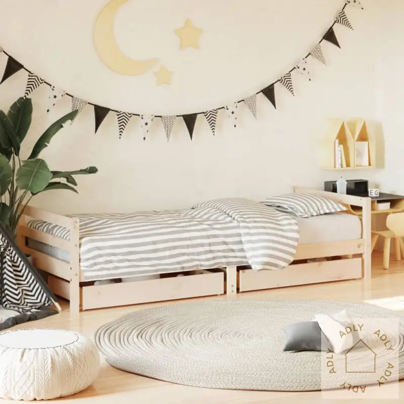 Heltre furu: Barnesengerammen er laget av heltre furu, et solid og bærekraftig naturmateriale som gir både varighet og karakter til rommet. Strukturen med rette årringer og synlige knuter gir den et sjarmerende og rustikt utseende, perfekt for deg som vil ha robuste produkter til hjemmet.Solide lameller: Den robuste rammen har stabile trelameller som gir god støtte til madrassen, sikrer jevn vektfordeling og fremmer ventilasjon. Dette gir barna komfort natt etter natt, samtidig som lamellene forlenger levetiden til både seng og madrass.Oppbevaringsskuff: To praktiske oppbevaringsskuffer følger med, og hjelper deg å holde orden på leker, klær eller sengetøy. Alt du trenger er lett tilgjengelig, så det er enkelt å ha det ryddig og oversiktlig på barnerommet.Funksjonelt hodegavl og fotgavl: Barnesengen har både hodegavl og fotgavl. De hjelper til å holde madrassen på plass og gir ekstra trygghet, samt tilfører designet stilrene linjer som passer sammen med moderne bokhyller og stående hyller.Omtenksomt design: Senga er lav, slik at den er enkel for små barn å komme seg ut og inn av selv. Designet setter barnas sikkerhet og brukervennlighet først, noe som gir de små frihet og trygghet fra første dag.Godt å vite: