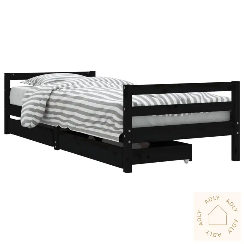 Farge: svartMateriale: heltre furuSamlet mål: 205,5 x 85,5 x 52 cm (L x B x H)Størrelse på egnet madrass: 80 x 200 cm (B x L) (madrass er ikke inkludert)Mål på hver skuff: 90 x 48,5 x 12,5 cm (B x D x H)Passer for barn fra 4 år og eldreMontering kreves: ja