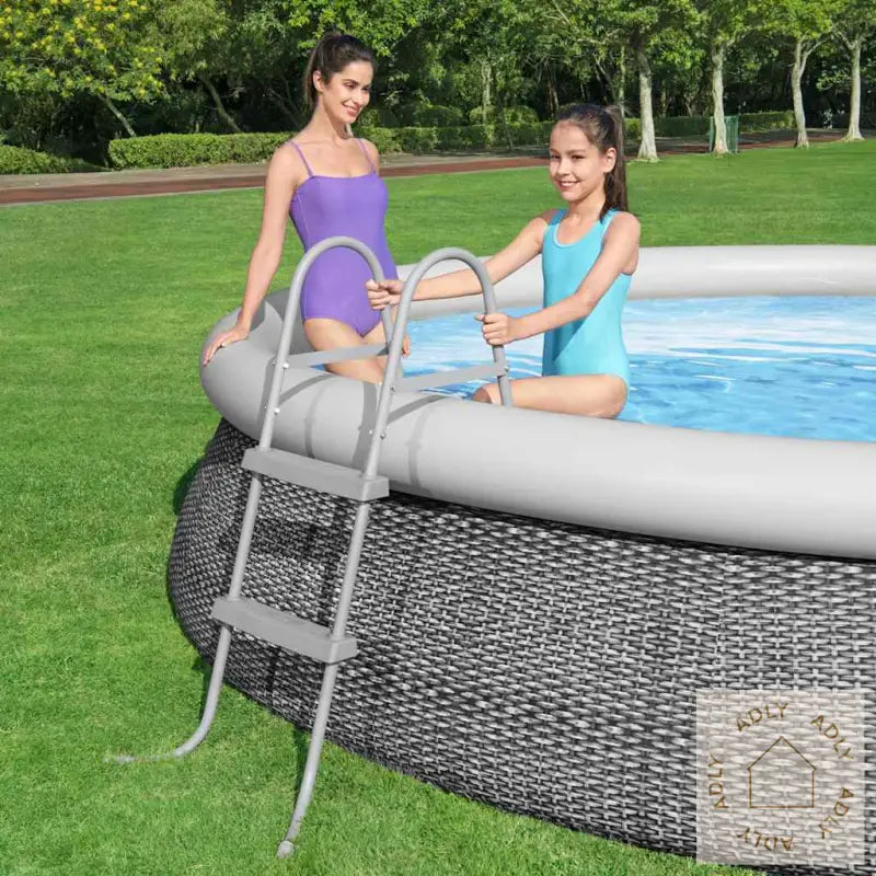 Farge: gråMaterialer: metall, plastEgnet høyde svømmebasseng (maks.): 84 cmMaksimal lastekapasitet: 150 kgMed 2 x 2 sklisikre trinnKorrosjonsbestandig stålrammeEgnet for vann med nøytral pH (ikke egnet for saltvann)Bestway varenummer: 58430