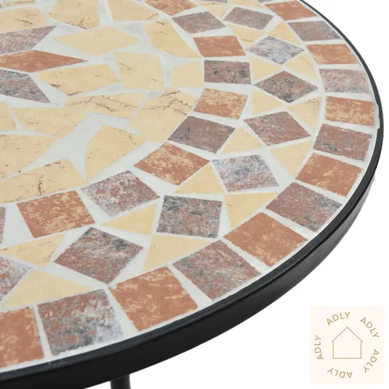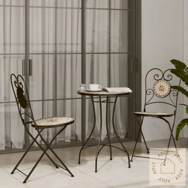 Den solide bordplaten i akasietre gir stabilitet og lang levetid, samtidig som den er enkel å vaske av med en fuktig klut – ideelt for kresne huseiere.Både bord og stoler har en robust pulverlakkert jernramme som gjør hele settet ekstra sterkt og holdbart. Du får hagemøbler av høy kvalitet, med materialer som tåler daglig bruk både inne og ute.Bistrostolene har sammenleggbart design, slik at du lett kan brette dem sammen for plassbesparelse eller praktisk oppbevaring når de ikke er i bruk.Det flotte mosaikkdesignet på overflaten skaper umiddelbart en varm middelhavsfølelse og blir et frisk blikkfang, enten du vil gi liv til uterommet eller skape hyggelige soner innendørs.Godt å vite: