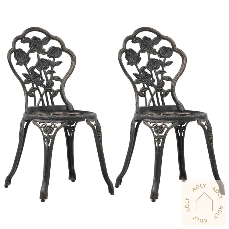 Farge: bronseMaterialer: sete og ryggstøtte i støpt aluminium + ben i støpejernMål: 41 x 49 x 81,5 cm (B x D x H)Bredde sete: 36,5 cmDybde sete: 33,5 cmHøyde sete fra bakken: 39 cmVærbestandigLeveransen inkluderer 2 stoler