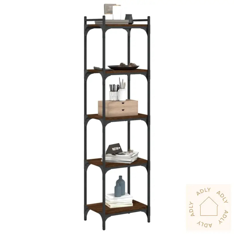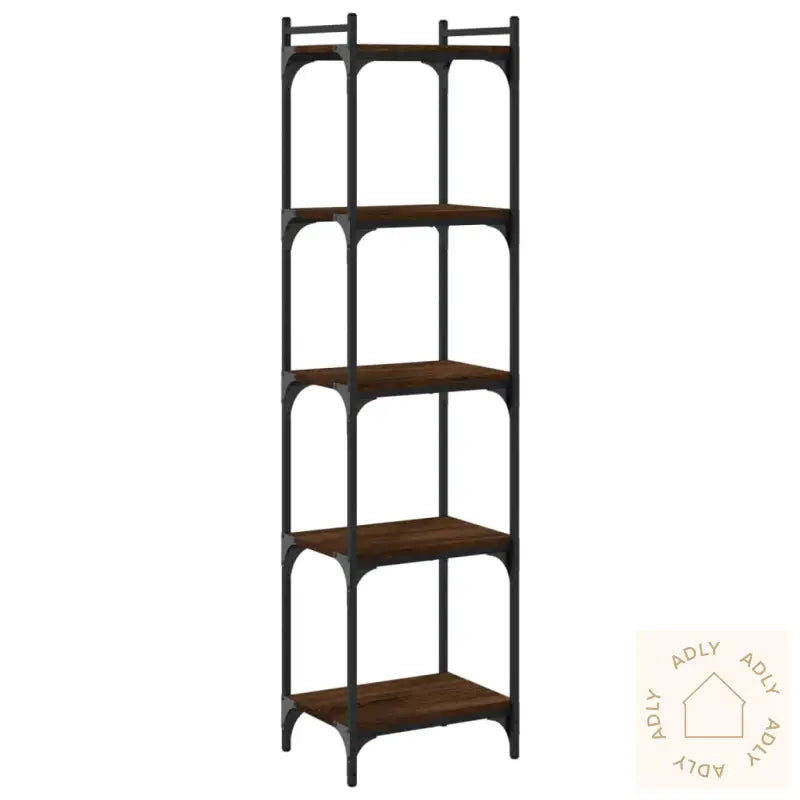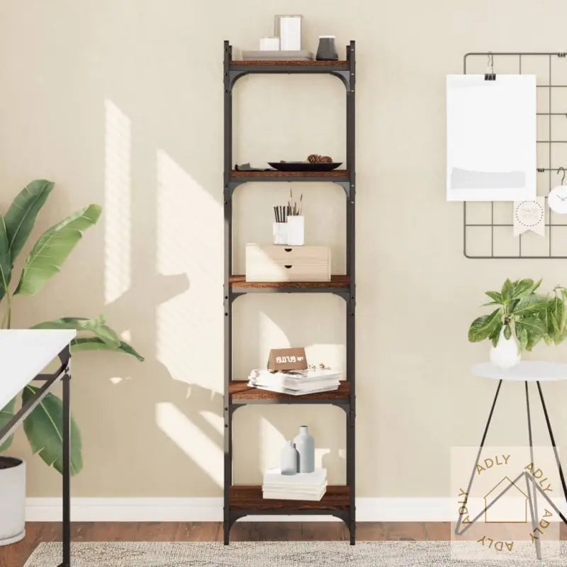 Slitesterkt materiale: Bokhyllen er laget av konstruert tre av høy kvalitet, med en jevn overflate som er enkel å holde ren. Materialet sikrer styrke og lang levetid, samtidig som det gir stabilitet og motstand mot fuktighet – veldig praktisk dersom hyllen skal stå i rom hvor det kan forekomme litt ekstra fuktighet.Rikelig med oppbevaring: Med flere åpne hyller har du god plass til å oppbevare bøker, blader, dekor og alt av småting du vil ha innenfor rekkevidde. Dette hjelper deg å holde stua eller arbeidsrommet både ryddig og oversiktlig.Justerbare føtter: De fire justerbare føttene med solide plastputer gjør det enkelt å balansere bokhyllen selv om gulvet er litt ujevnt. Dette gir økt stabilitet og reduserer risikoen for at bokhyllen står skjevt eller vipper – ideelt for trygt bruk hjemme.Metallramme: Den robuste metallrammen gir bokhyllen et moderne, industrielt uttrykk og gjør møbelet enda mer slitesterkt. Du får både design og holdbarhet i ett produkt.Advarsel: