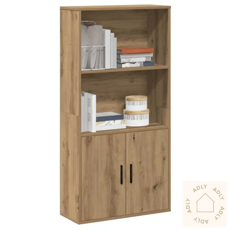 Stabilt og slitesterkt materiale: Bokhyllen er laget av konstruert tre, kjent for sin styrke, holdbarhet og jevne overflate. Dette materialet er motstandsdyktig mot fuktighet, vridning og sprekker, så du får et møbel som varer lenge, selv ved daglig bruk.Rikelig med oppbevaringsplass: Med to åpne hyller og to rom med dører får du god plass til å oppbevare og holde orden på både boksamlingen, magasiner og dokumenter. Hyllene gjør det også lett å vise fram saker du er stolt av, mens rommene med dører beskytter innholdet mot støv og gir hjemmet et ryddigere preg.Praktisk dør: Lukkede rom gir deg muligheten til å skjule det som ellers kan skape rot, slik at rommet alltid føles oversiktlig. Dørene gjør at tingene dine ligger trygt bak lukkede flater og beskyttes mot støv.Allsidig bruk: Denne bokhyllen i artisan eik kan brukes til mye mer enn bøker. Sett inn bilder, små planter eller dekorative gjenstander for å skape et personlig preg. Passer like godt til hjemmekontoret som til stua – og komplementerer resten av møblene hjemme.Lett å vedlikeholde: Den glatte overflaten gjør at støv og smuss enkelt kan tørkes vekk med en fuktig klut – perfekt for deg som vil ha stilige utendørsmøbler eller hagemøbler uten mye vedlikehold.Advarsel: