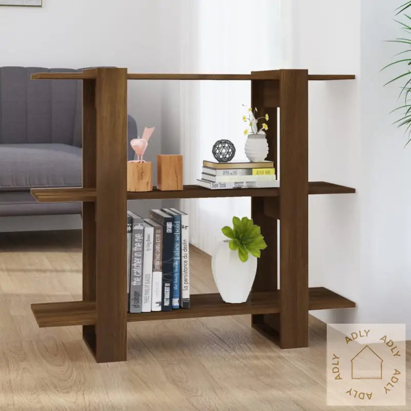Farge: brun eikMateriale: konstruert treSamlet mål: 100 x 30 x 87 cm (B x D x H)Mål hver hylle: 100 x 27 x 35 cm (B x D x H)Kan brukes både som bokhylle og romdeler, og passer sammen med andre møbler til hjemmet og hagemøblerMontering kreves: jaADVARSEL: For å forhindre at produktet velter, bruk de medfølgende festemidlene til vegg.