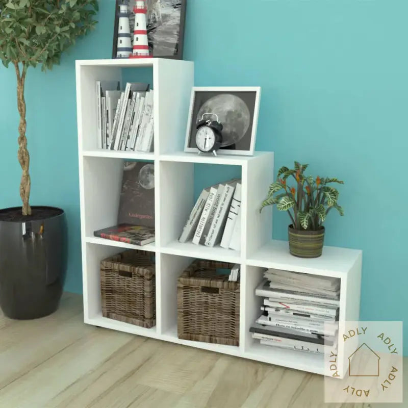 Denne bokhyllen har et unikt, trappelignende design som skaper et moderne uttrykk og gjør den til et skikkelig blikkfang i ethvert rom. Med åpne rom fordelt på flere nivåer får du en allsidig løsning for oppbevaring og utstilling – perfekt til bøker, pyntegjenstander, potteplanter, premier eller annet du vil fremheve. Den er laget av slitesterkt, melaminbelagt konstruert tre, noe som gir både stabilitet og lang levetid, så denne hyllen holder seg fin år etter år.