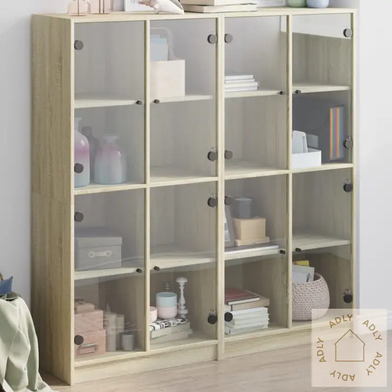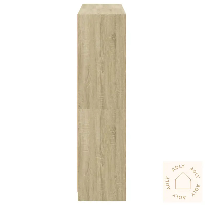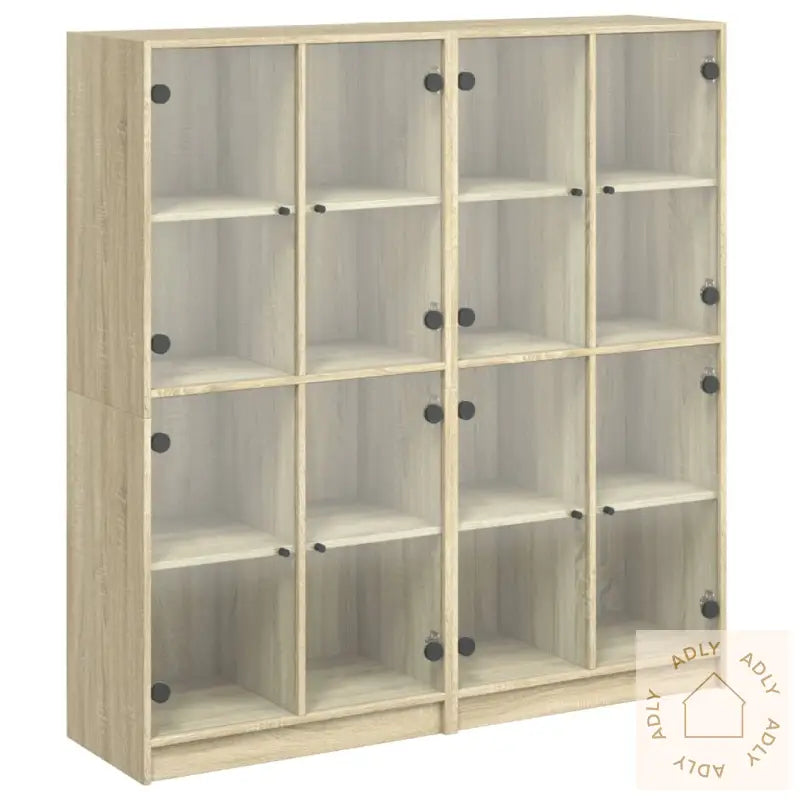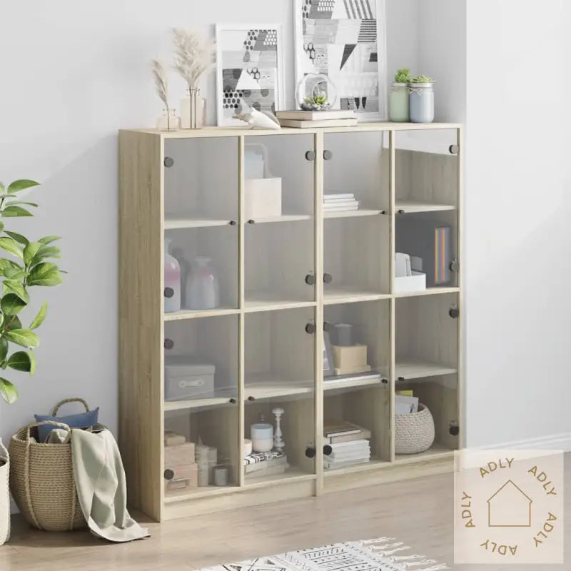Solid og holdbart materiale: Bokhyllen er laget av konstruert treverk av høy kvalitet, med glatt overflate som gir både styrke og lang levetid. Dette stabile materialet er motstandsdyktig mot fuktighet, noe som gjør at møbelet holder seg pent år etter år—even når det står på rom med varierende klima. Særlig finishen i sonoma eik gir et naturlig og tidløst uttrykk som glir rett inn blant moderne møbler.Rikelig med oppbevaringsplass: Med hele 16 rom har du god plass til å sortere og lagre alt fra bøker til magasiner, mapper og dokumenter. Hver hylle gir deg fleksibiliteten til å finne ditt eget system og holde det ryddig—perfekt for alle som elsker orden eller trenger ekstra lagring hjemme.Stabil og solid topp: Topplaten på skapet kan uten problem bære dekorative elementer, bilder, potteplanter og lignende. Slik får du fram personlige detaljer og gjør bokhyllen til en del av hjemmets helhetlige stil.Praktisk design: Glassdørene sørger for at det du lagrer bak dem holder seg støvfritt, samtidig som det ser oversiktlig og ryddig ut. Hendige svarte håndtak sørger for enkel åpning og lukking, som gir deg rask tilgang til alt du trenger.Advarsel: