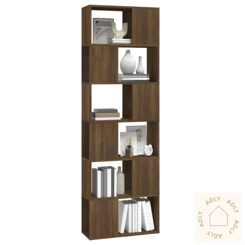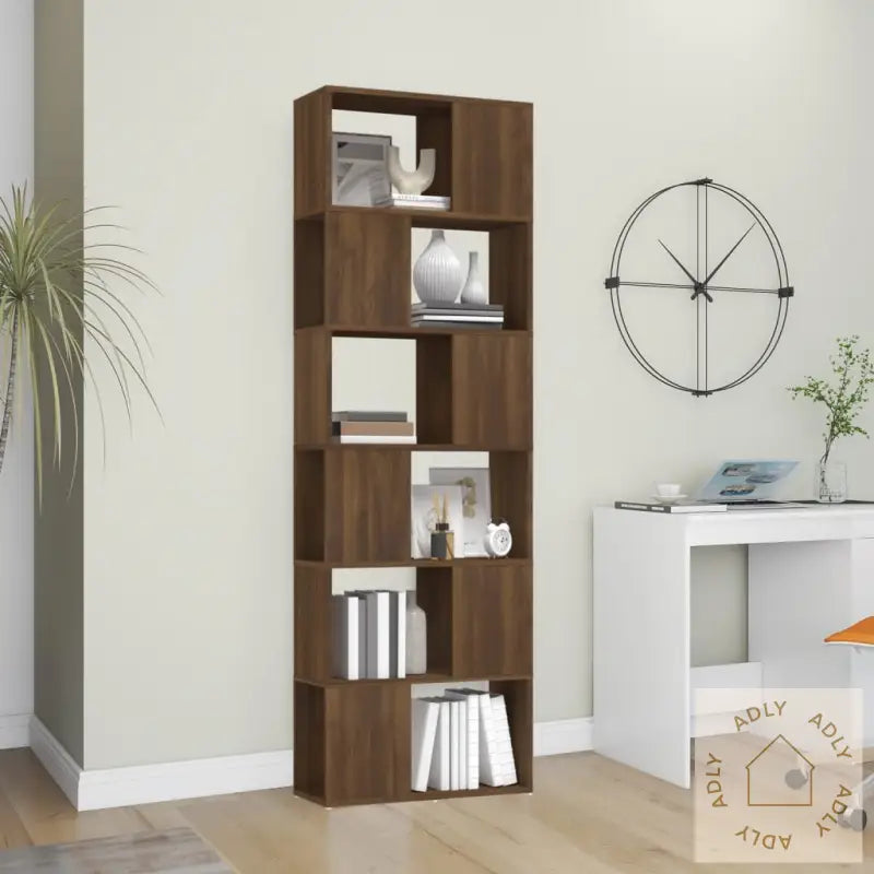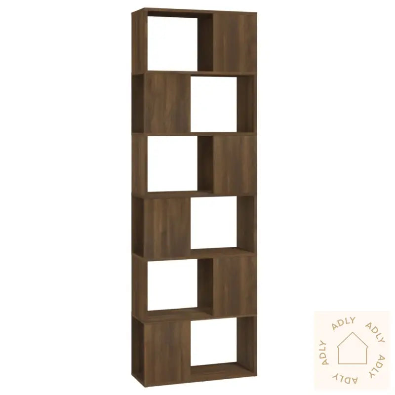 Slitesterkt materiale: Bokhyllen er laget av høykvalitets konstruert tre i brun eik-farge, som gir et stilrent uttrykk samtidig som materialet har en glatt overflate, imponerer med styrke, stabilitet og beskytter mot fuktighet – det gjør den både holdbar og lettstelt over tid.Rikelig med lagringsplass: Med 6 romslige hyller får du god plass til både bøker, magasiner, DVD-er, multimediaenheter og pyntegjenstander. Det sikrer at alt kan organiseres ryddig og er lett tilgjengelig når du trenger det.Allsidig hylle: Denne bokhyllen er designet slik at den også kan brukes som en romdeler. Det gjør den spesielt anvendelig hvis du ønsker å skape tydelige soner, for eksempel i stue eller på kontor. Kombinasjonen av funksjonalitet og design gir huset ditt et løft – og passer godt sammen med andre møbler til hjemmet eller utendørsmøbler dersom overgangen mellom inne og ute er sømløs.Enkel rengjøring: Overflaten på bokhyllen er lett å holde ren og frisk – det eneste som trengs er en fuktig klut. Slik bevarer du det elegante utseendet uten anstrengelser.Advarsel: