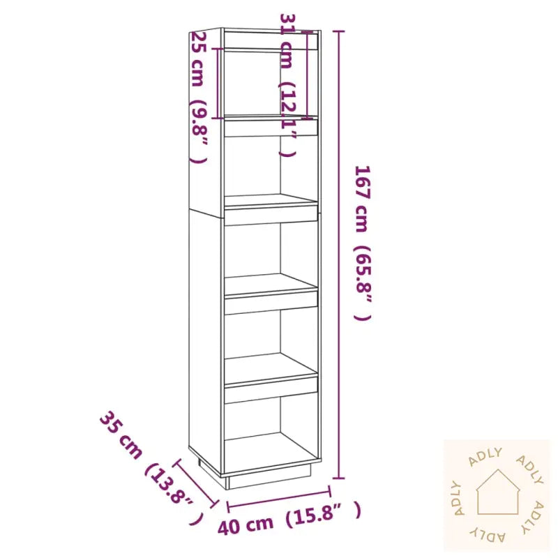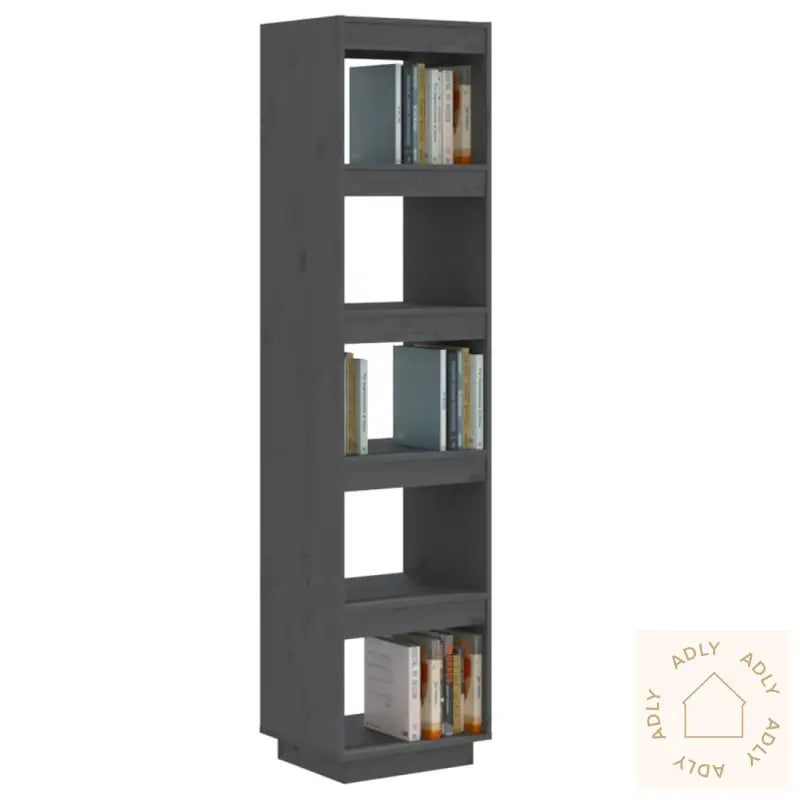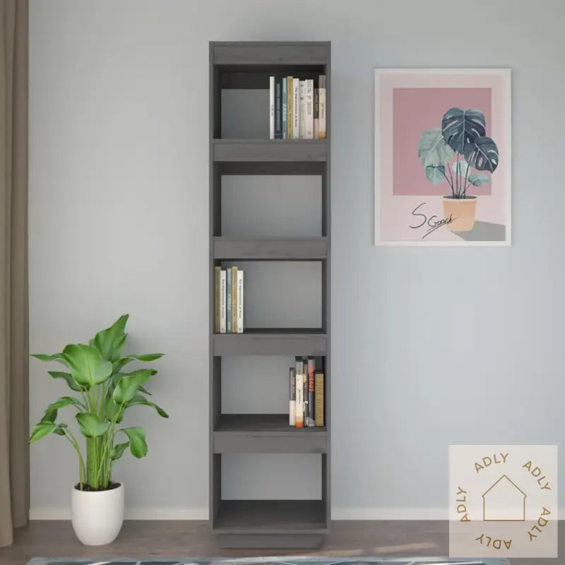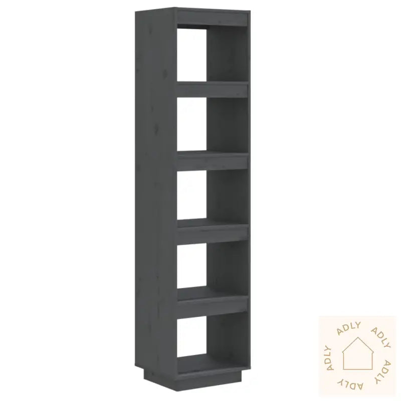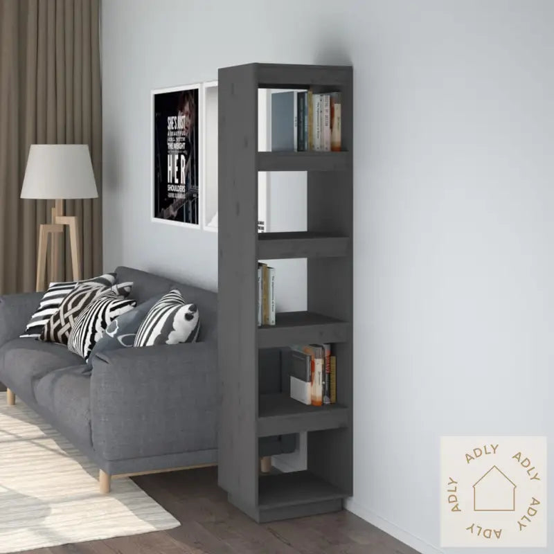 Farge: gråMateriale: heltre furuMål: 40 x 35 x 167 cm (B x D x H)Kan brukes som bokhylle eller romdelerMontering kreves: jaADVARSEL: For å sikre at produktet ikke velter, må du bruke de medfølgende festene til vegg.