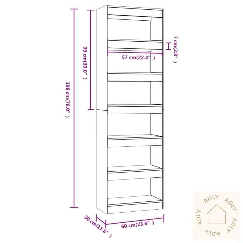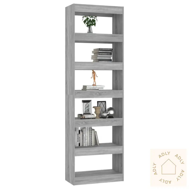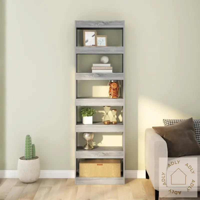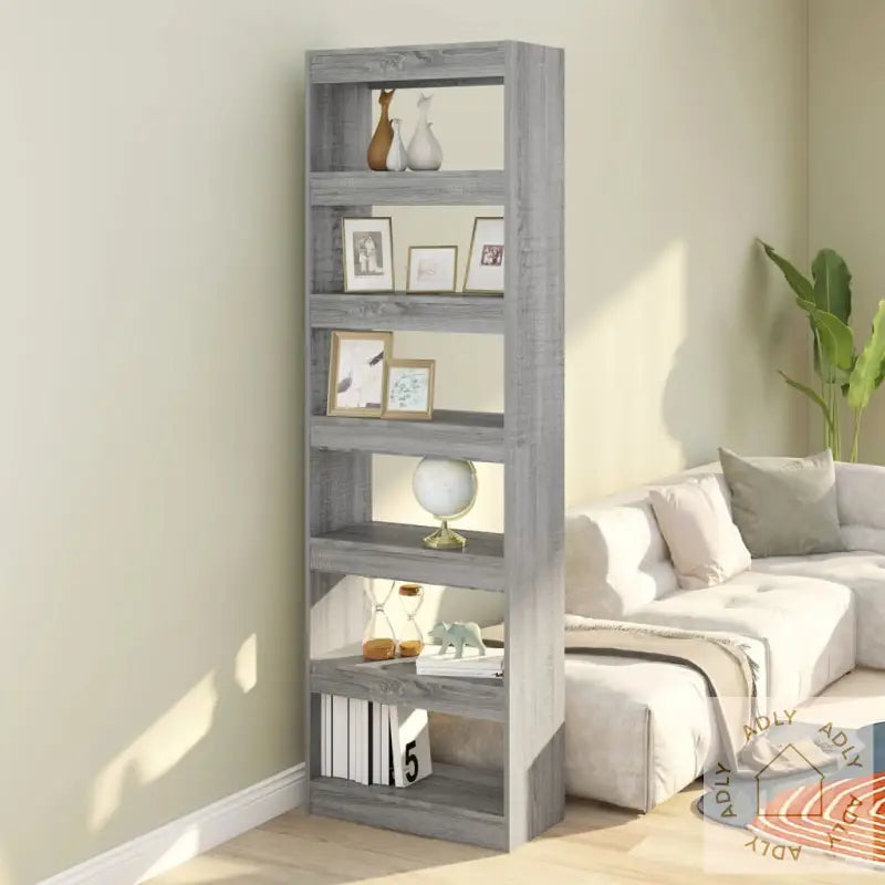 Farge: grå eikMateriale: konstruert treMål: 60 x 30 x 198 cm (B x D x H)Kan brukes både som bokhylle eller romdelerMontering kreves: jaADVARSEL: For å forhindre at produktet velter, må de medfølgende festemidlene for vegg alltid brukes.
