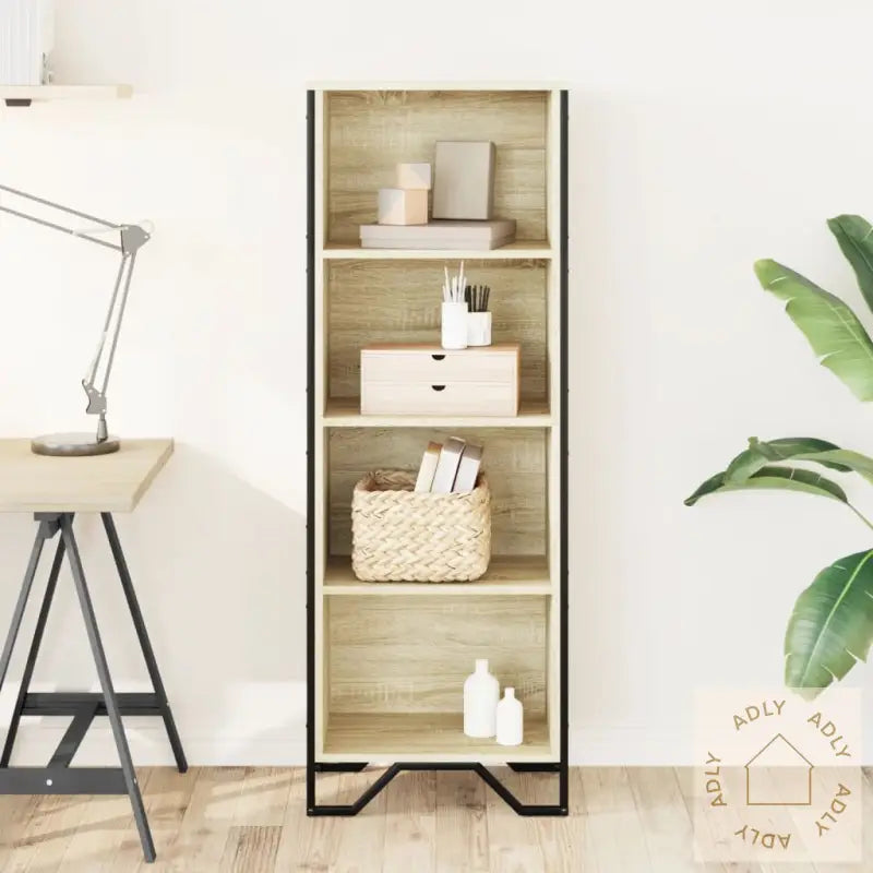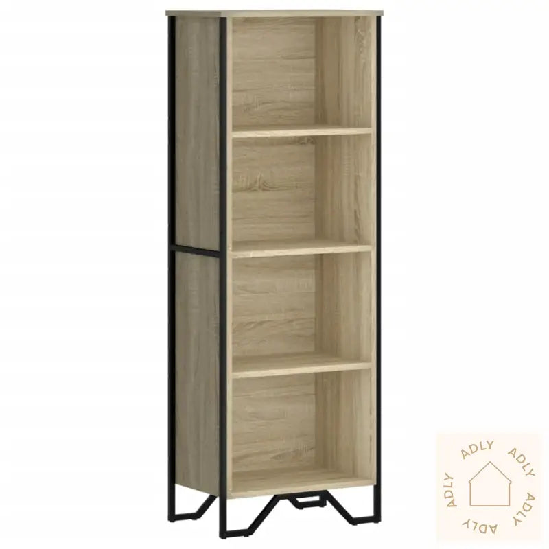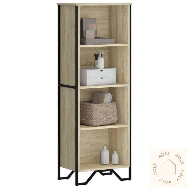 Holdbart materiale: Bokhyllen er laget av høykvalitets konstruert tre med en glatt overflate, noe som gir både styrke, stabilitet og god motstandsdyktighet mot fuktighet. Dette sikrer langvarig bruk og gjør den perfekt til aktiv hverdagsbruk i norske hjem.Rikelig med oppbevaringsplass: Fire åpne rom gir deg masse plass til å organisere bøker, dekor eller annet tilbehør. Alt holdes ryddig og lett tilgjengelig – akkurat slik man ønsker seg i funksjonelle møbler for moderne hjem.Stabil og solid topp: Den flate toppen er ideell for å vise frem favorittdekor som bilder, potteplanter eller små suvenirer. Her får du muligheten til å personliggjøre bokhyllen og gjøre sonoma eik-utseendet til et blikkfang i rommet.Metallføtter: De moderne metallføttene gir bokhyllen en trendy og rolig stil, samtidig som de sikrer god stabilitet, selv på ujevne gulv. Metallføttene løfter helhetsinntrykket og matcher mange ulike stiler av hagemøbler eller andre møbler til hjemmet.Advarsel: