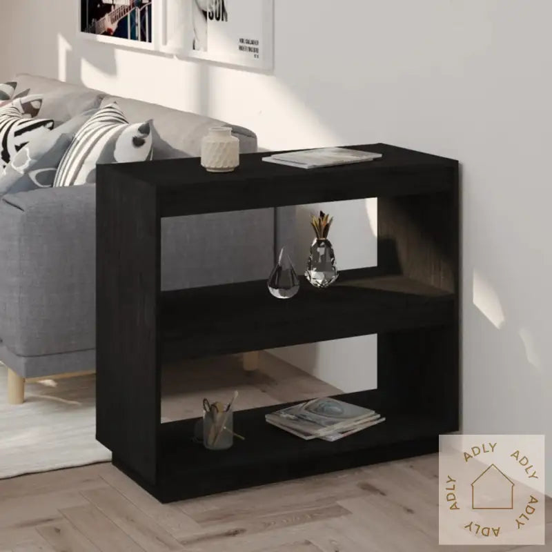 Farge: svartMateriale: heltre furuMål: 80 x 35 x 71 cm (B x D x H)Montering kreves: jaADVARSEL: For å sikre at bokhyllen står stødig og unngå at den velter, må de medfølgende festemidlene brukes til å feste møbelet til veggen.