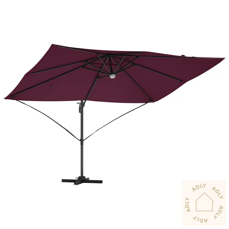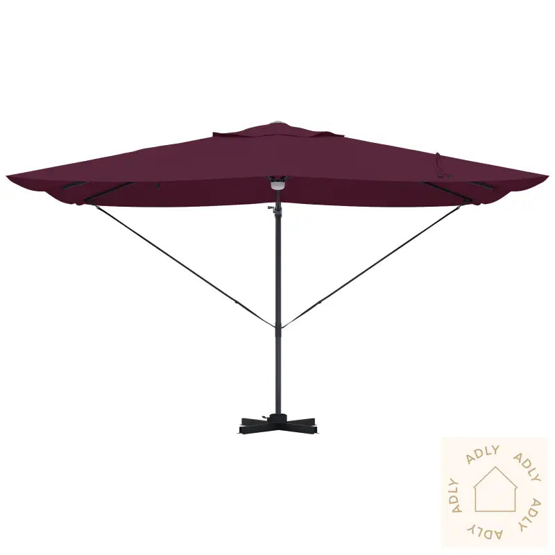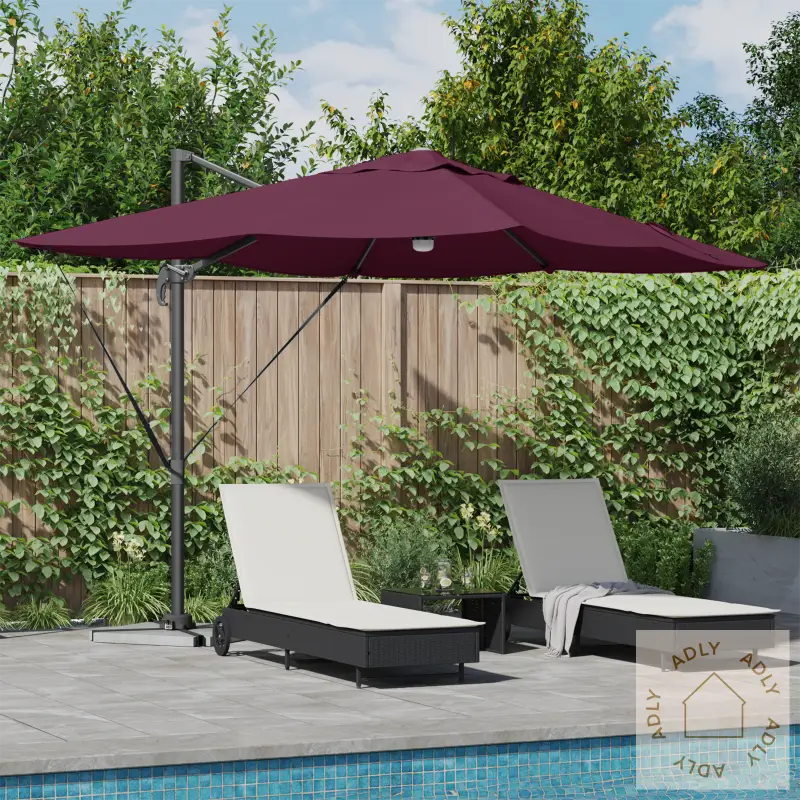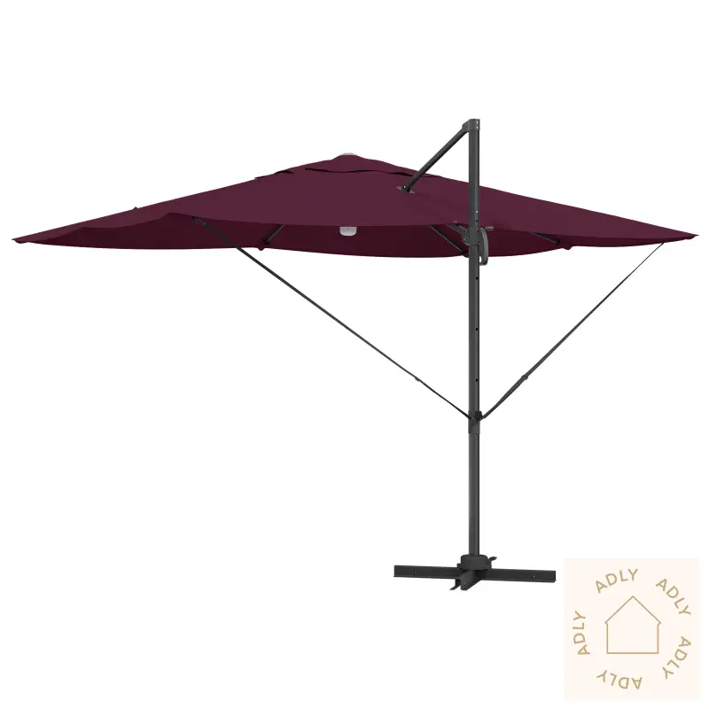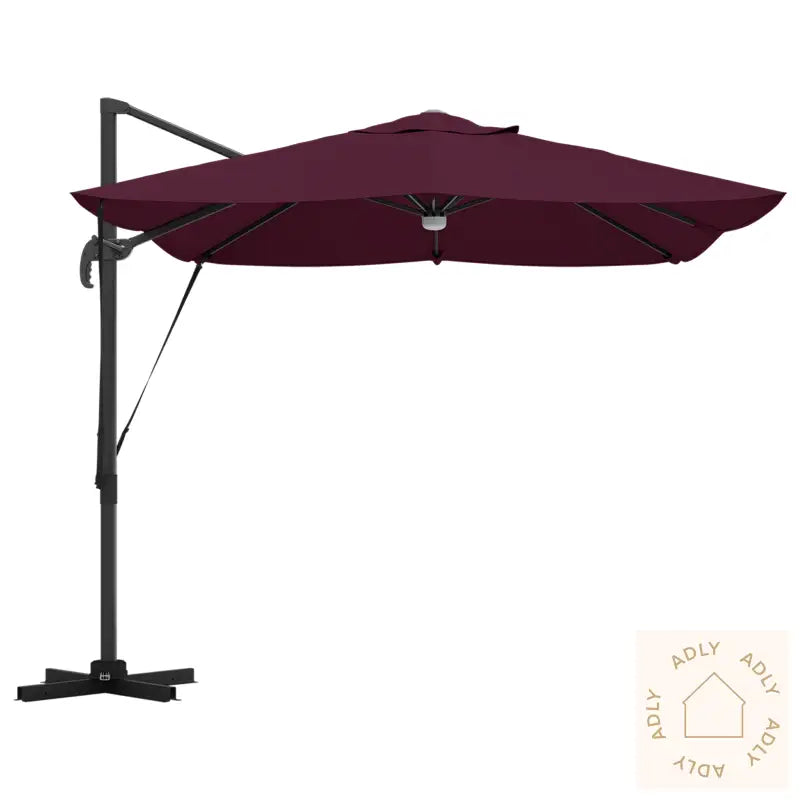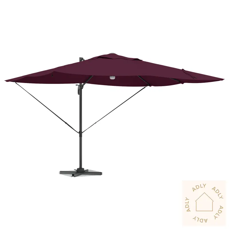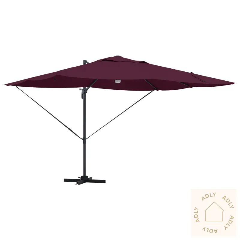 Denne middels store cantilever-parasollen i burgunder gir et stilfullt og praktisk innslag til uterommet ditt, enten det gjelder terrassen, hagen eller balkongen. Perfekt for deg som er ute etter moderne hagemøbler som kombinerer komfort med funksjon, og gir et behagelig sted å nyte utendørslivet.