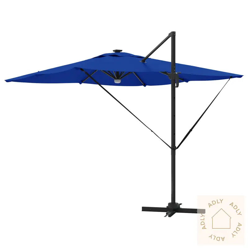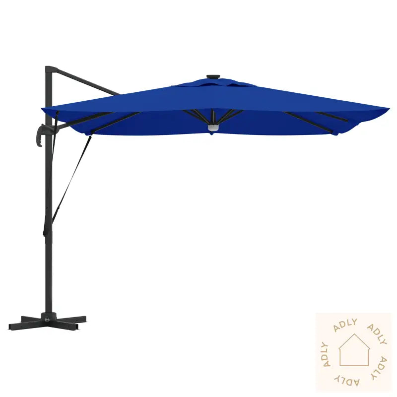 Farge: BlåLyskraft: VarmhvitForm: RektangulærMateriale: Metall, aluminiumOverflate: PulverlakkertKontakt inkludert: NeiInnendørs/Utendørs: Kun utendørsRom: Hage og terrasseStrømkilde: SolBatterier inkludert: NeiDimensjoner: 285 x 286 x 270 cm (B x L x H)Stangdiameter: 6,7 cmStanghøyde: 270 cmLevering inneholder: Parasol med kryssbase, vindbeskyttelsesrep, solcelledrevet LED-lampe.Montering kreves: JaAnbefalt antall personer for montering: 2Med denne parasollen får du ikke bare funksjonelle og stilrene utendørsmøbler, men et flott midtpunkt på uteplassen som løfter hele miljøet. Perfekt som supplement til dine møbler til hjemmet og en smart investering for lange, lyse sommerdager og kvelder.