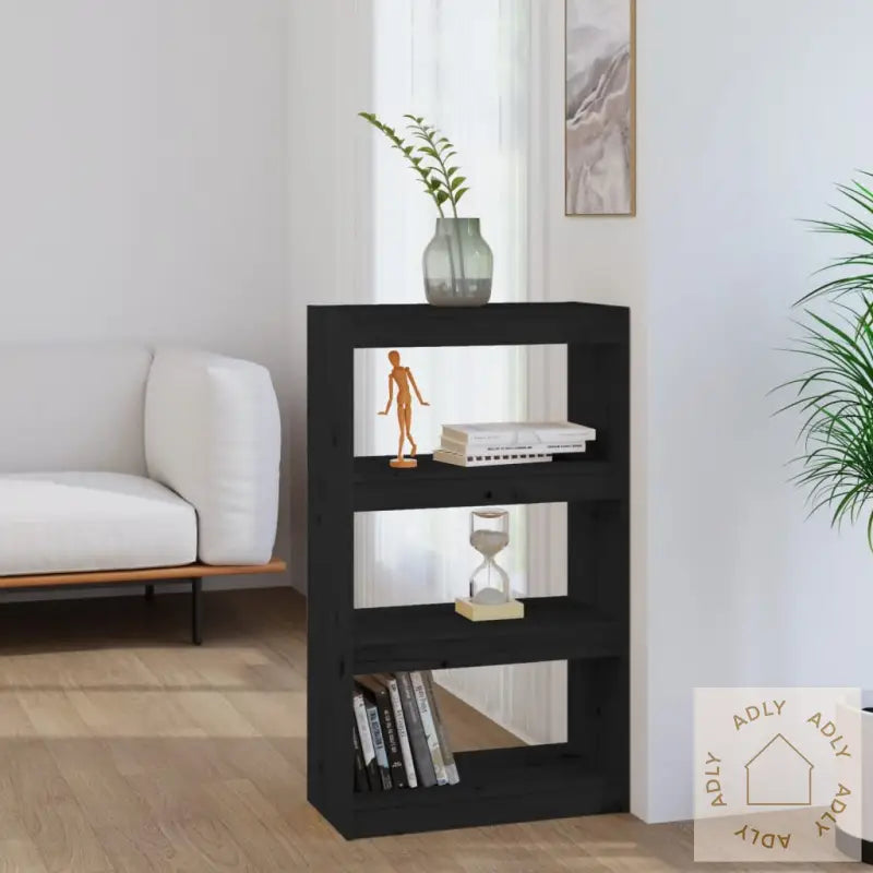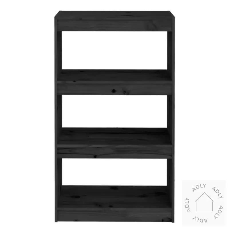 Farge: svartMateriale: heltre furuMål: 60 x 30 x 103,5 cm (B x D x H)Kan brukes som bokhylle eller romdelerMontering kreves: jaADVARSEL: For å forhindre velting, må dette produktet brukes med veggfesteenheten som følger med