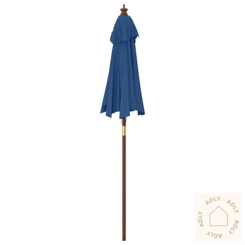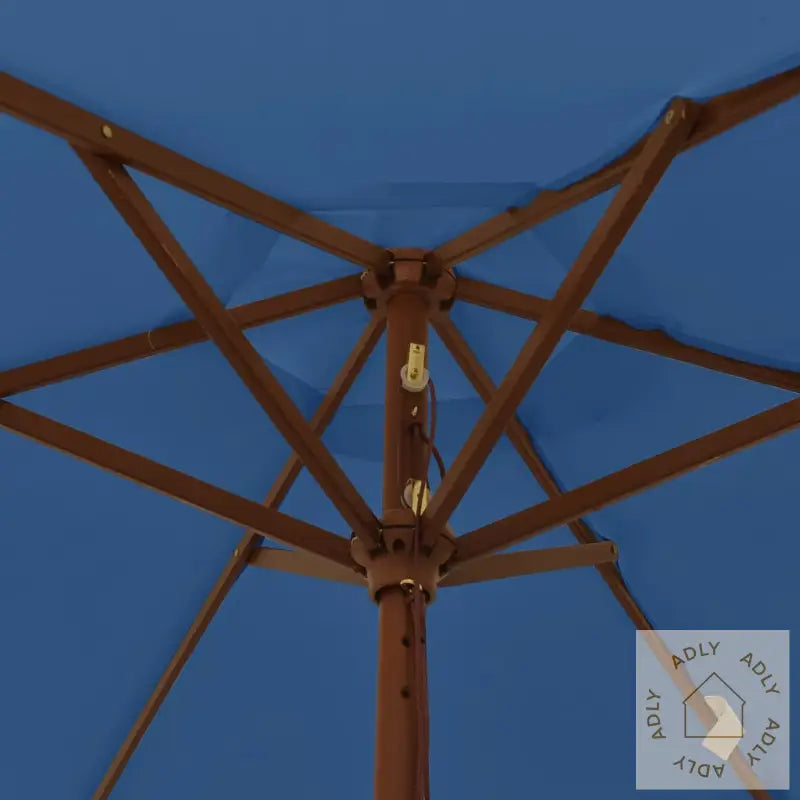 Produktet er ikke helt vanntett. For best mulig vannbeskyttelse anbefales det å bruke en vanntett spray før du tar parasollen i bruk sammen med dine hagemøbler.Farge: asurblå – et friskt og moderne innslag blant dine utendørsmøbler.Materiale ramme: massivt løvtre med teakfarget overflate og laminert bambus – robust og stilig.Materiale trekk: slitesterkt stoff i 100% polyester.Samlet størrelse: 196 x 231 cm (Diameter x Høyde) – gir godt med skygge for både små og store uteplasser.Stangens diameter: 38 mm.Med luftventilasjon på toppen.6 solide spiler følger med for ekstra stabilitet.Utstyrt med et brukervennlig enkelt trinsesystem.Montering kreves, men går raskt så du kan nyte utelivet på kort tid.