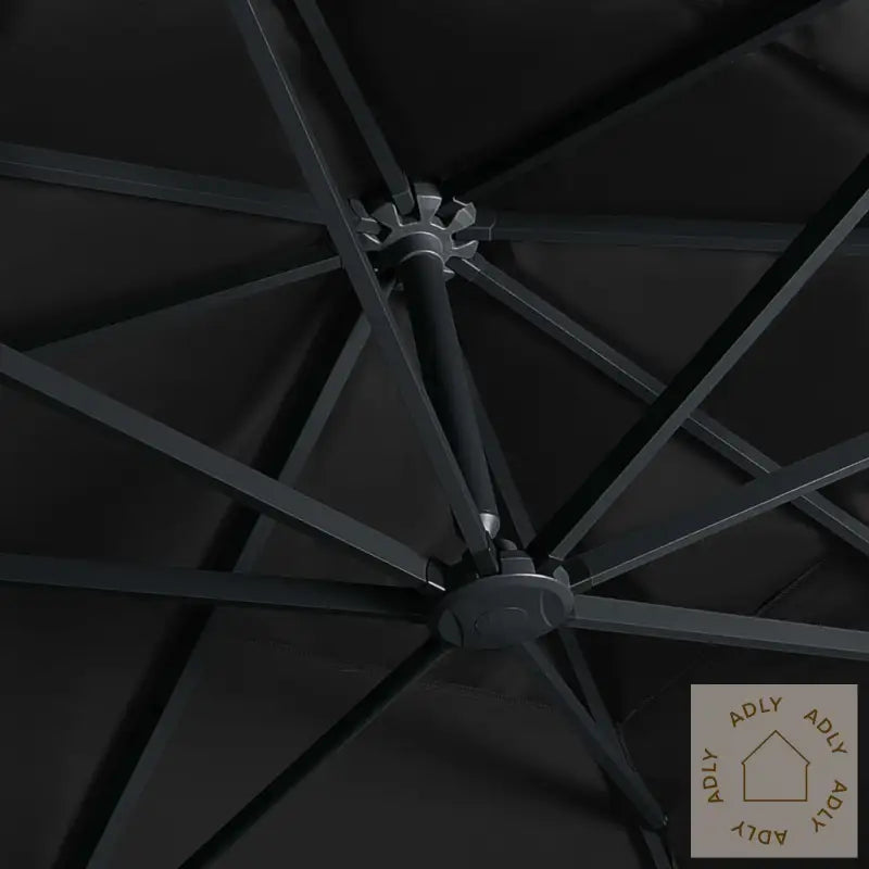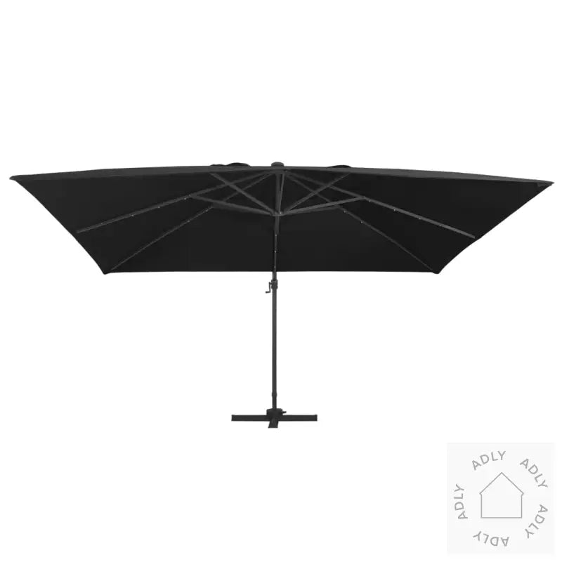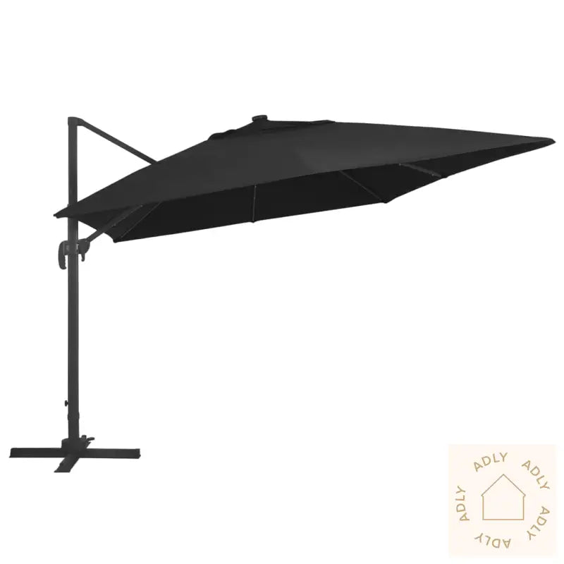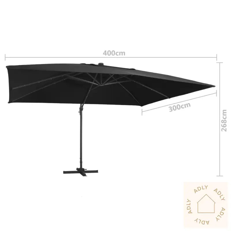 Farge skjerm: svartMaterialer: stoff med PA-belegg, pulverlakkert aluminiumSamlet mål: 400 x 300 x 268 cm (L x B x H)Mål kryssfot: 100 x 100 cm (L x B)Mål stang: 7 x 5 cm (L x B)Inkluderer 24 LED-lys og et solpanelMed lufteventil og sveivesystemVippbar og 360-graders roterende designInkluderer 8 aluminiumsspilerMontering kreves: jaMed denne solide parasollen gir du uterommet et løft som matcher resten av dine møbler eller møbler til hjemmet, perfekt hvis du liker å skape en gjennomført stil fra hagemøbler til bokhyller og stående hyller inne.