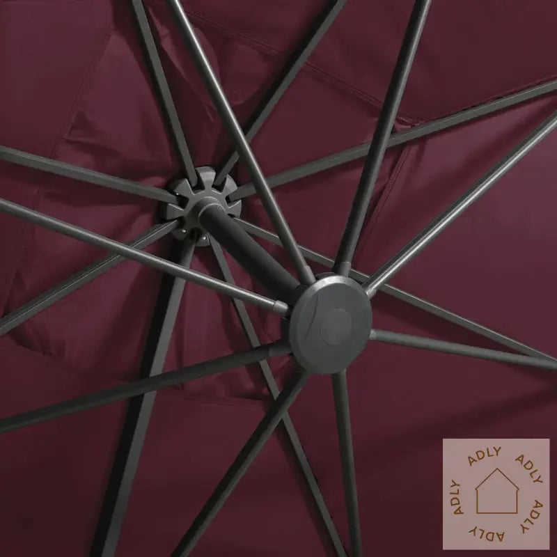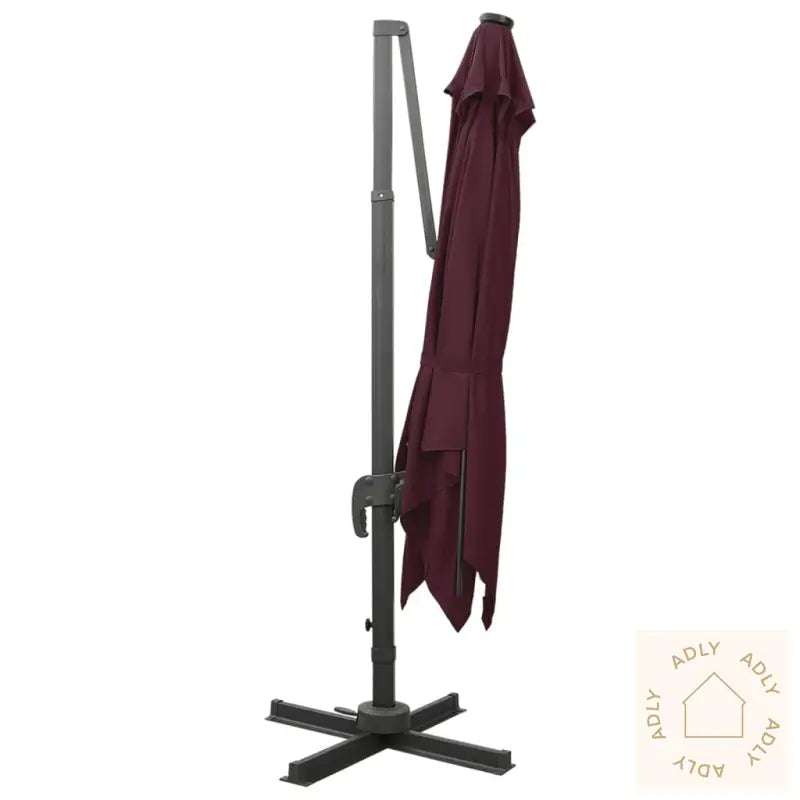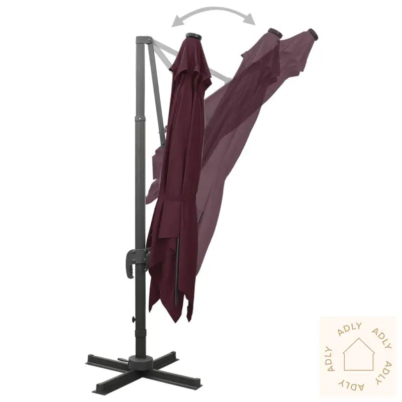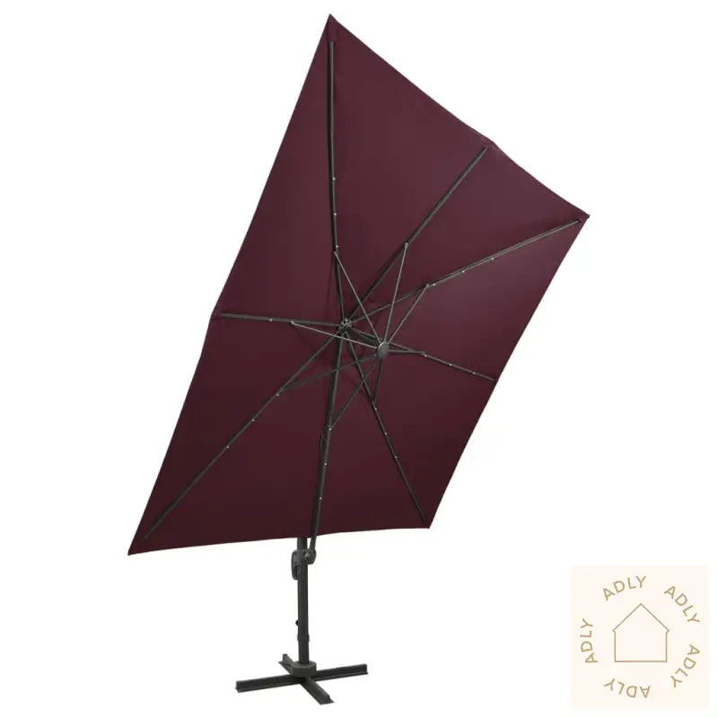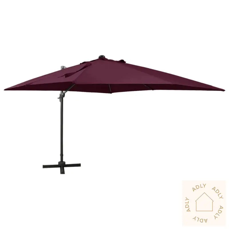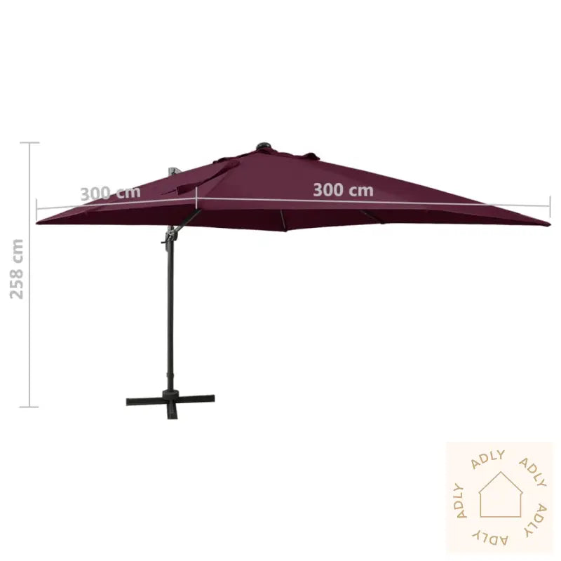 Farge: vinrødMaterialer: stoff med PA-belegg, aluminiumSamlet mål: 300 x 300 x 258 cm (L x B x H)Mål kryssfot: 100 x 100 cm (L x B)Med luftventil og sveivesystemVippbar og 360-graders roterende designInkluderer 8 aluminiumsspilerInkluderer 24 LED-lysMontering kreves: ja