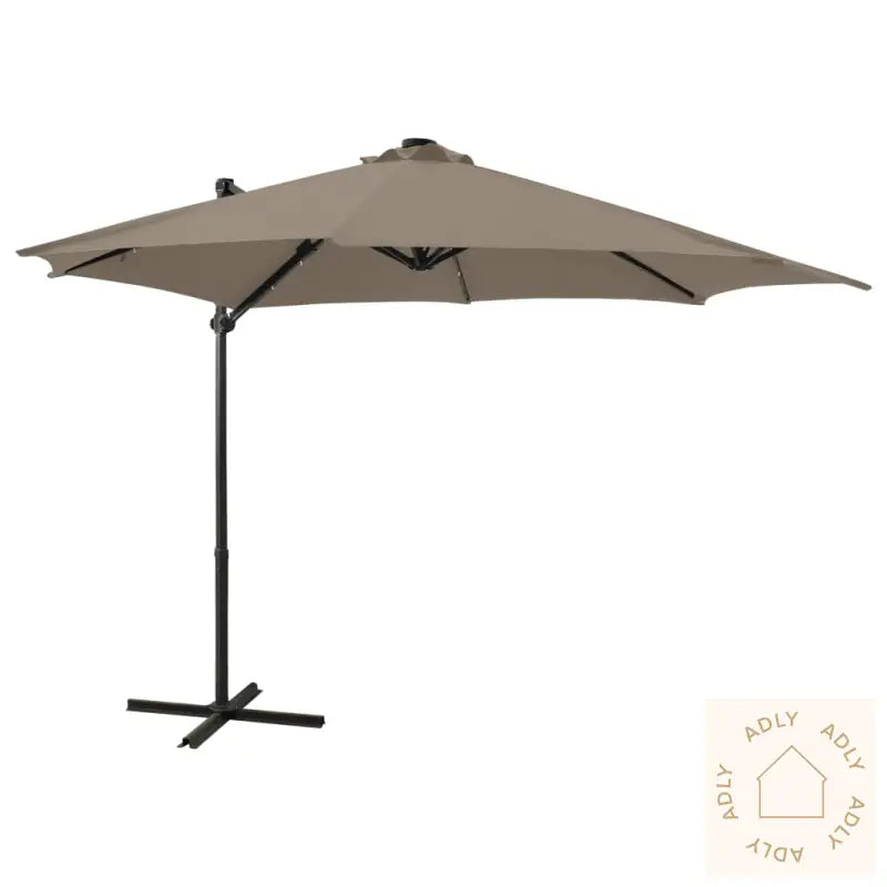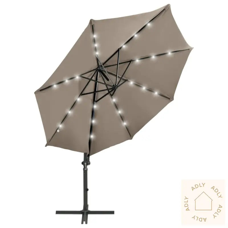 Farge: gråbrunMaterialer: stoff med PA-belegg, aluminiumSamlet mål: 300 x 238 cm (diameter x H)Mål kryssbase: 64,5 x 64,5 cm (L x B)Med luftventil og sveivesystemVippbar og 360-graders roterende designInkluderer 8 aluminiumsspilerInkluderer 24 LED-lysInkluderer en solcelleMontering kreves: ja