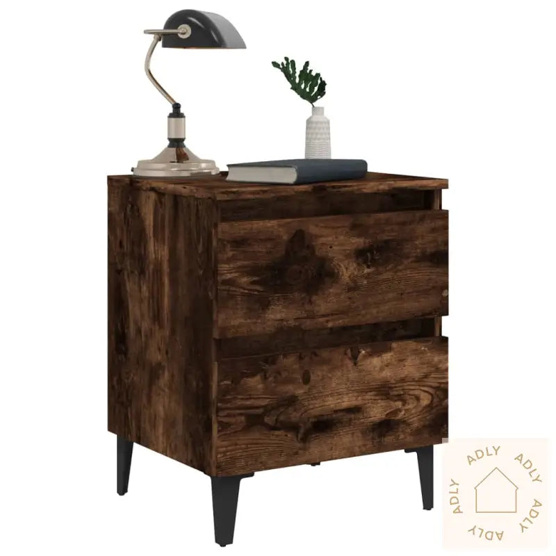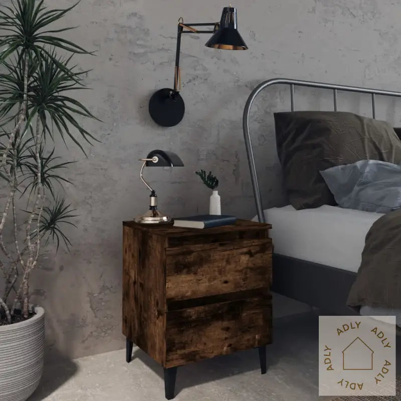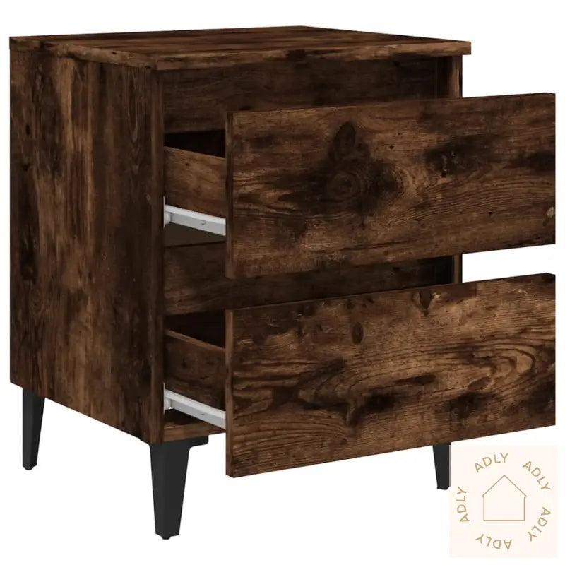 Nattbordet står stødig på fire solide metallben, noe som gir god stabilitet og lang levetid. Med to romslige skuffer får du masse oppbevaringsplass til bøker, småting eller hodetelefoner, så det blir enkelt å holde det ryddig rundt sengen. Den lekre overflaten i røkt eik gir et naturlig uttrykk som passer perfekt sammen med både moderne møbler og klassiske bokhyller og stående hyller. I tillegg er nattbordet laget av slitesterkt konstruert tre med detaljer i metall, så det tåler daglig bruk. Overflaten er enkel å vaske av med en fuktig klut, og gjør vedlikeholdet superenkelt.
