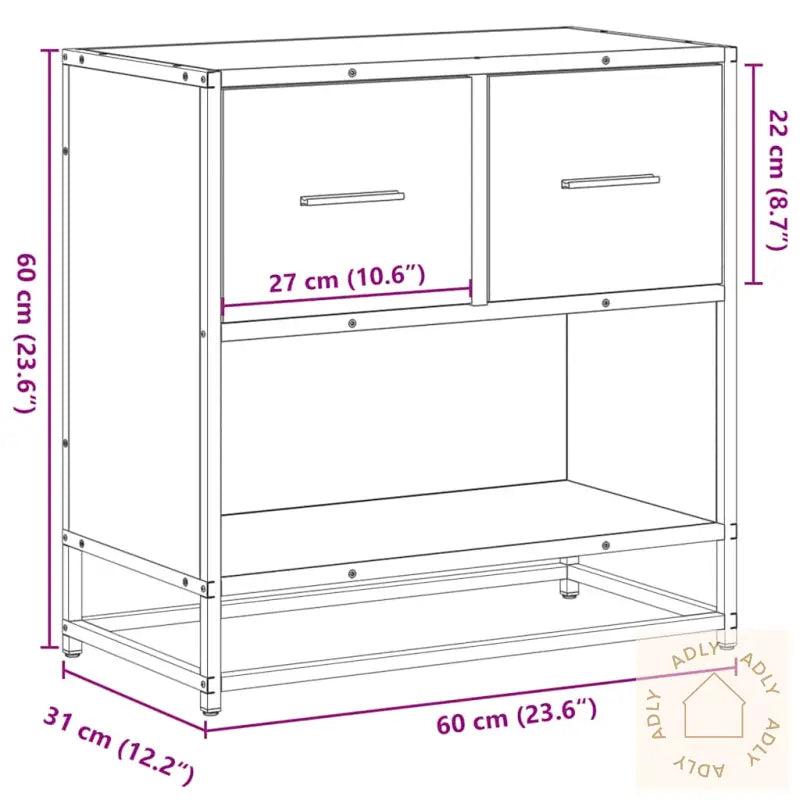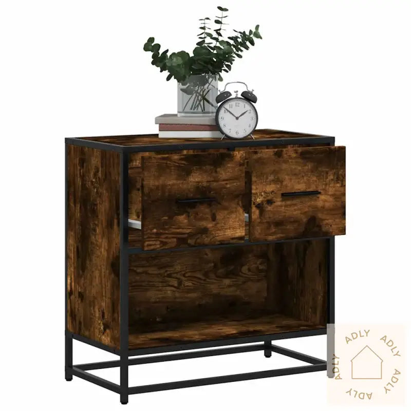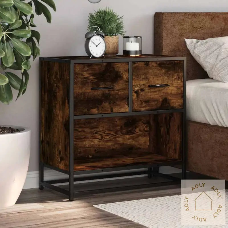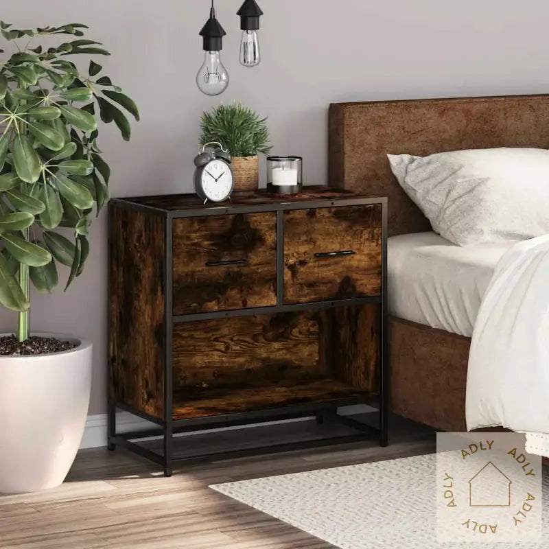 For sikker bruk bør du feste nattbordet med medfølgende festeanordninger for å hindre at det velter.Farge: røkt eikMaterialer: konstruert tre, metallSamlet mål: 60 x 31 x 60 cm (B x D x H)Antall skuffer: 2Total vektkapasitet: 60 kgVektkapasitet per skuff: 5 kgMontering kreves: ja