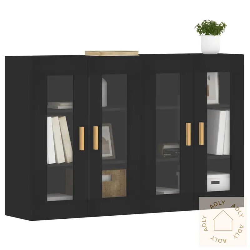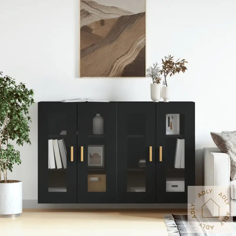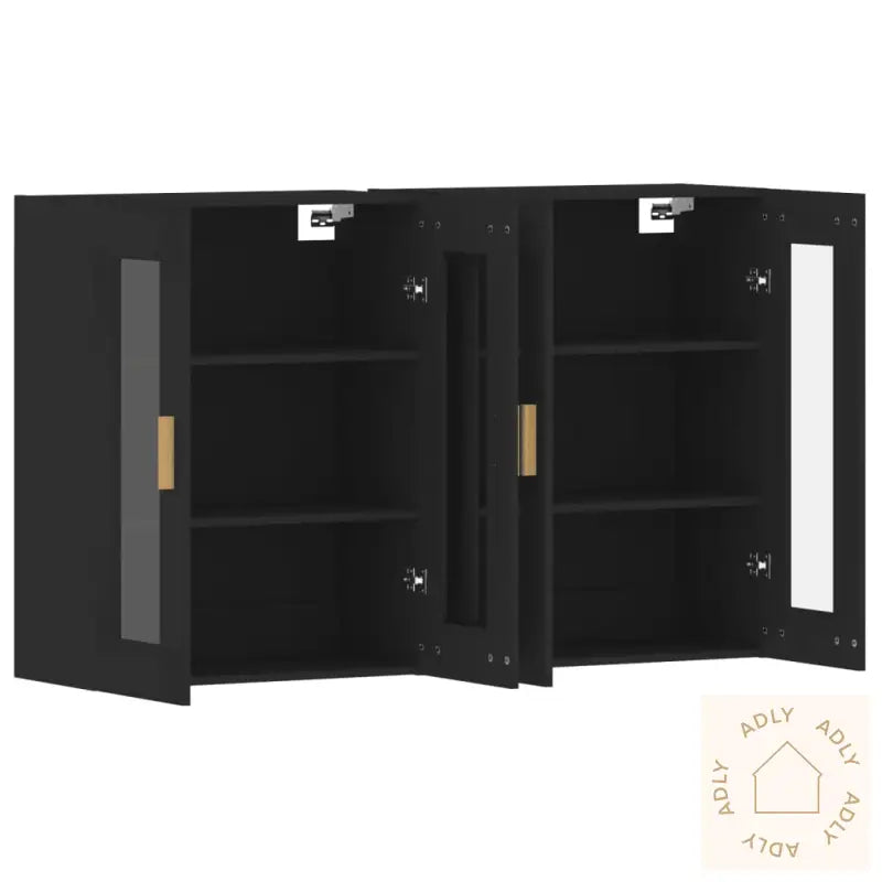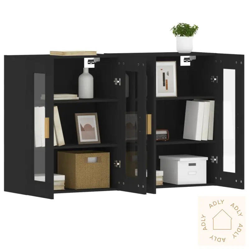 Skruer og plugger til veggmontering følger ikke med. Finn og bruk det som passer til din veggtype. Hvis du er usikker, få hjelp av fagfolk og følg monteringsveiledningen nøye.Farge: svartMaterialer: konstruert tre, heltre eukalyptus, glassMål (hver): 69,5 x 34 x 90 cm (B x D x H)Montering kreves: jaLeveransen inneholder:2 x vegghengte skap