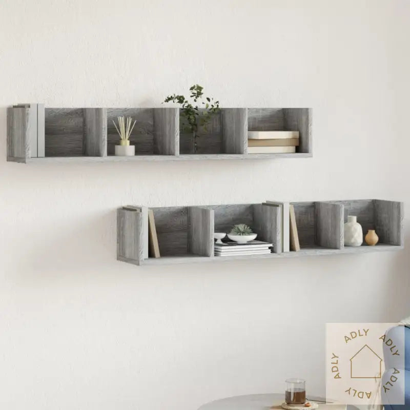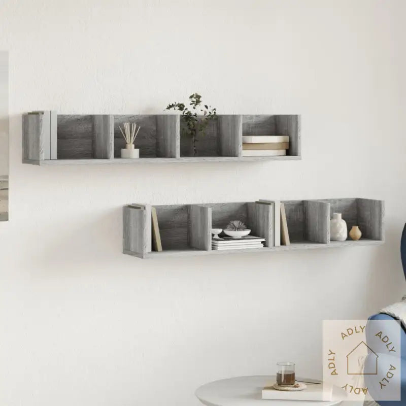 Solid materiale: Skapene er laget av konstruert tre, kjent for sin jevne overflate og robuste kvalitet. Materialet har høy motstandsdyktighet mot fukt, styrke og stabilitet, noe som gjør skapene perfekte som langvarig oppbevaringsløsning.Rikelig med lagringsplass: Den romslige flytende hyllen gir deg god plass til bøker, pyntegjenstander og andre ting du vil ha organisert og lett tilgjengelig – perfekt om du elsker orden i hjemmets møbler.Allsidig og moderne design: Veggskapene er fleksible i bruk, og kan for eksempel monteres under TV-en for å fungere som TV-benk, eller plasseres hvor som helst på veggen der du trenger smart oppbevaring. Designet gjør at de enkelt lar seg kombinere med andre møbler, som bokhyller og stående hyller, for et helhetlig uttrykk.Godt å vite: