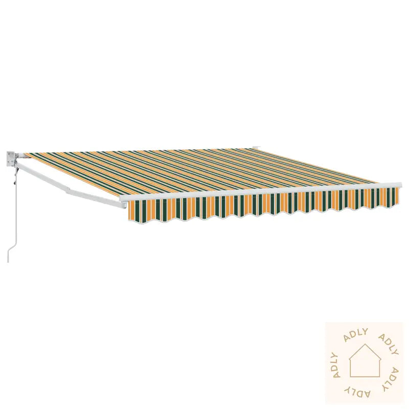 Denne uttrekkbare markisen er en super løsning for uteplassen, med et livlig design som gir både stil og funksjon til balkongen eller terrassen din. Det fargerike stripete stoffet i gule, grønne og blå nyanser gir området ditt et friskt, innbydende uttrykk, samtidig som det effektivt skjermer for sollys når du slapper av eller samler venner. Perfekt å matche med hagemøbler eller andre møbler til hjemmet for å skape en komplett atmosfære.