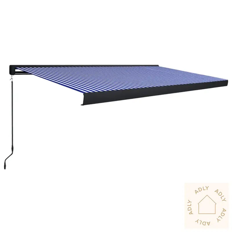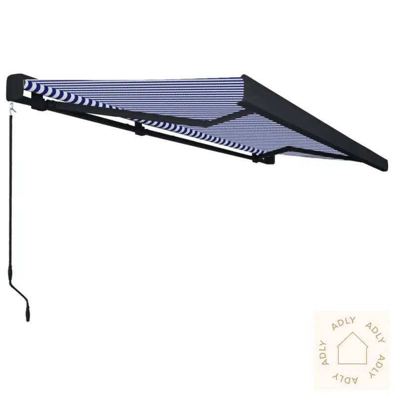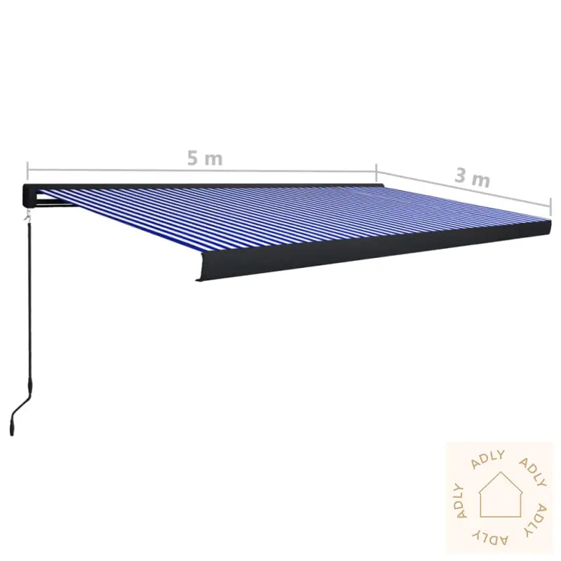 Farger: blå og hvitMaterialer: pulverlakkert aluminium, stoff med PU-beleggStoff: 100% polyesterBredde: 500 cmMaksimal projeksjon: 300 cmMed standard veggbraketterManuell betjeningMontering kreves: ja