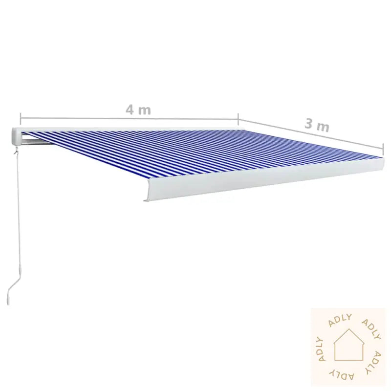 Farger: blå og hvitMaterialer: pulverlakkert aluminium, stoff med PU-beleggStoff: 100% polyesterBredde: 400 cmMaksimal projeksjon: 300 cmMed standard veggbraketter for enkel monteringManuell betjening – trekkes ut og inn etter behovMontering kreves