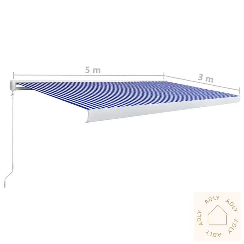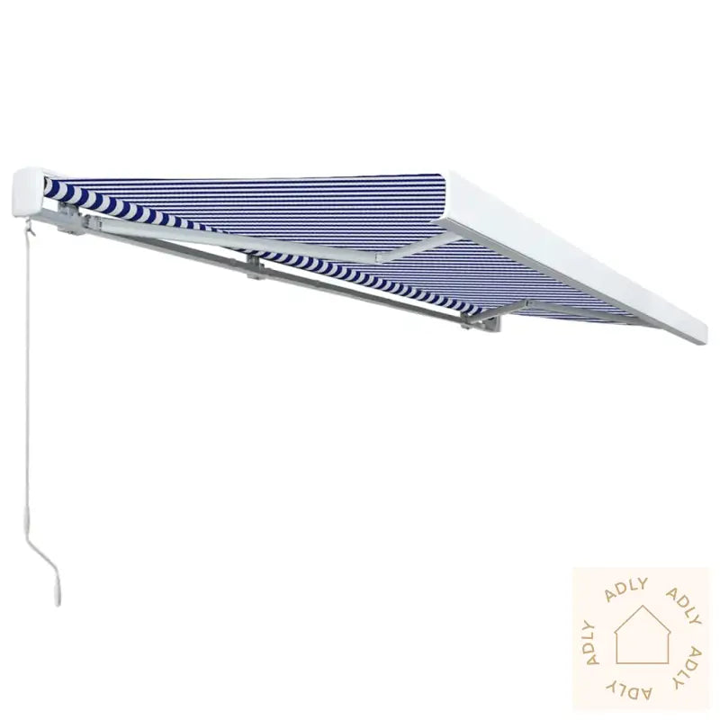 Farger: blå og hvitMaterialer: pulverlakkert aluminium, stoff med PU-beleggStoff: 100% polyesterBredde: 500 cmMaksimal projeksjon: 300 cmMed standard veggbraketterManuell betjeningMontering kreves: ja