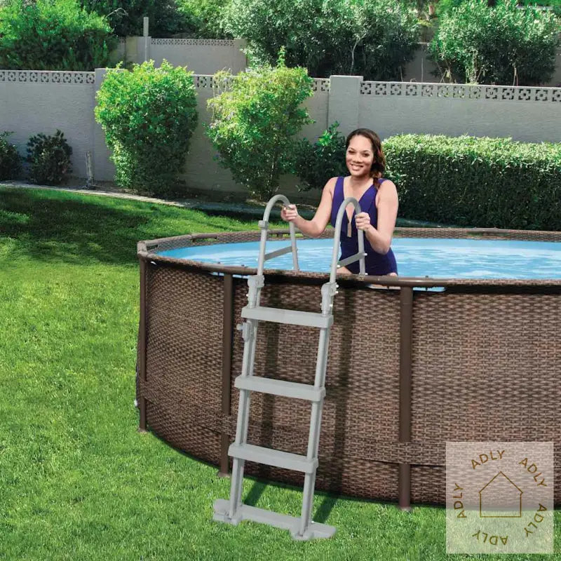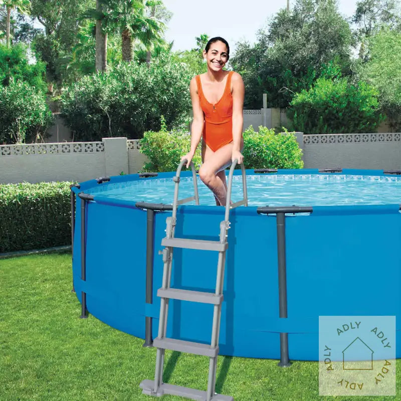 Bassengstigen passer perfekt for svømmebasseng med opptil 122 cm høyde og tåler belastning opptil 150 kg, noe som gjør den egnet for de fleste familier. Stigen er lett å montere, slik at du raskt kan ta den i bruk og fokusere på å nyte hagen din og bassengområdet sammen med praktiske utemøbler eller bokhyller og stående hyller for organisering av bassengtilbehør. Vennligst merk at stigen kun er egnet for basseng med nøytral pH-verdi og anbefales ikke til saltvannsbasseng.
