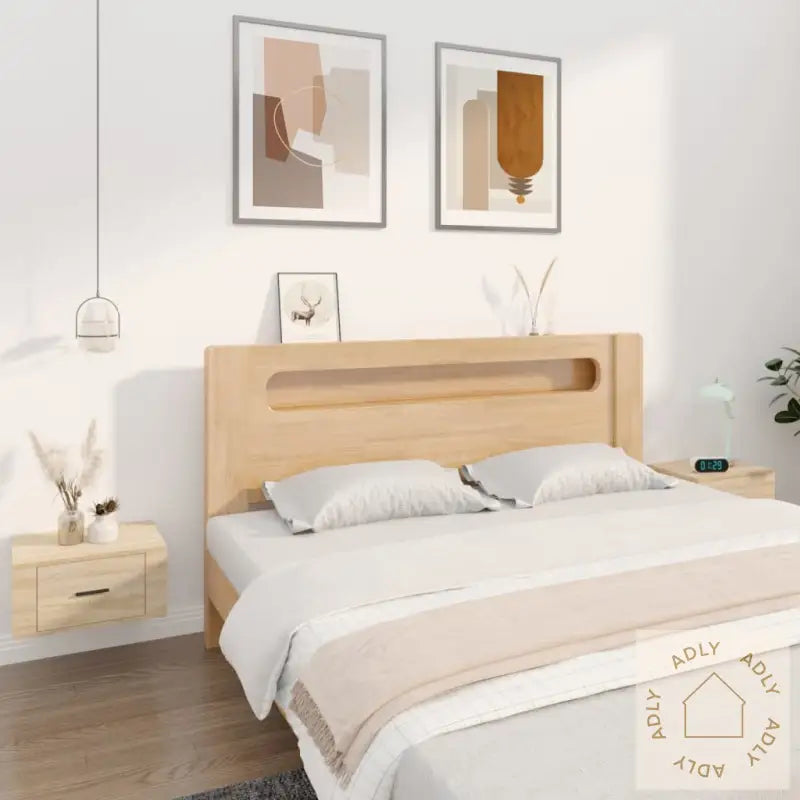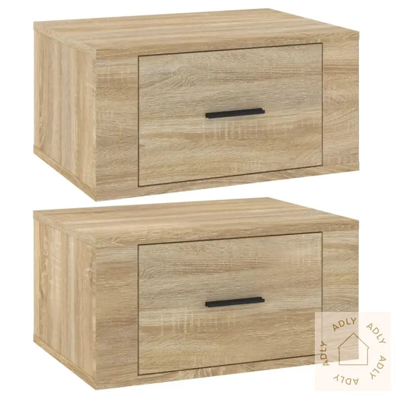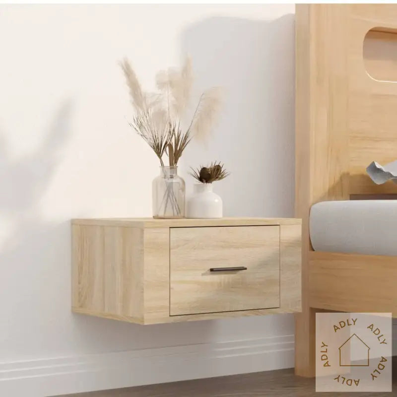 Slitesterkt materiale: De flytende nattbordene er laget av konstruert tre i høy kvalitet. Materialet gir en jevn og pen overflate som er enkel å rengjøre, og det er både sterkt og stabilt. I tillegg har det god motstand mot fuktighet, noe som gjør disse nattbordene ekstra holdbare.Rikelig med lagringsplass: Med sine smarte hyller tilbyr hvert nattbord rikelig plass til å holde bøker, briller, ladere eller andre småting organisert og lett tilgjengelig rett ved sengen.Veggmontert funksjon: Fordi nattbordene monteres på veggen, sparer du både gulvplass og får et ryddigere uttrykk på soverommet. Den flytende løsningen gjør det også lettere å støvsuge og rengjøre under møblene.Robust topp: Den solide toppen i sonoma eik gir deg en perfekt flate til å stille ut favorittdekorasjonene dine, enten det er fotorammer, lys, vekster i potte eller andre gjenstander du vil ha fremme.Merk: