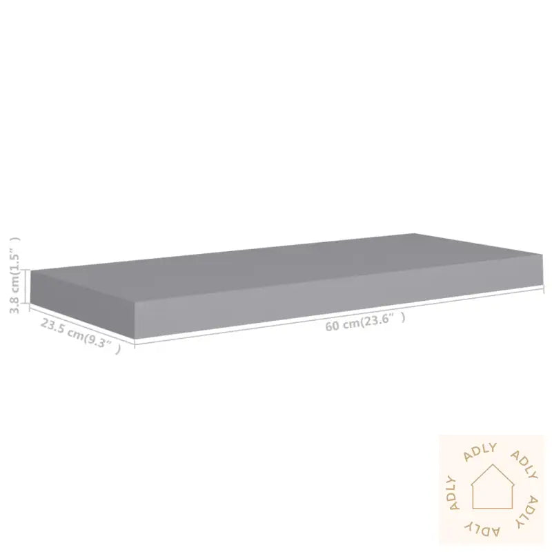 Farge: gråMaterialer: bikake MDF, metallMål: 60 x 23,5 x 3,8 cm (L x B x H)Maksimal lastekapasitet (hver): 7 kgUsynlig monteringssystemMontering kreves: jaLeveransen inneholder:2 x vegghyller