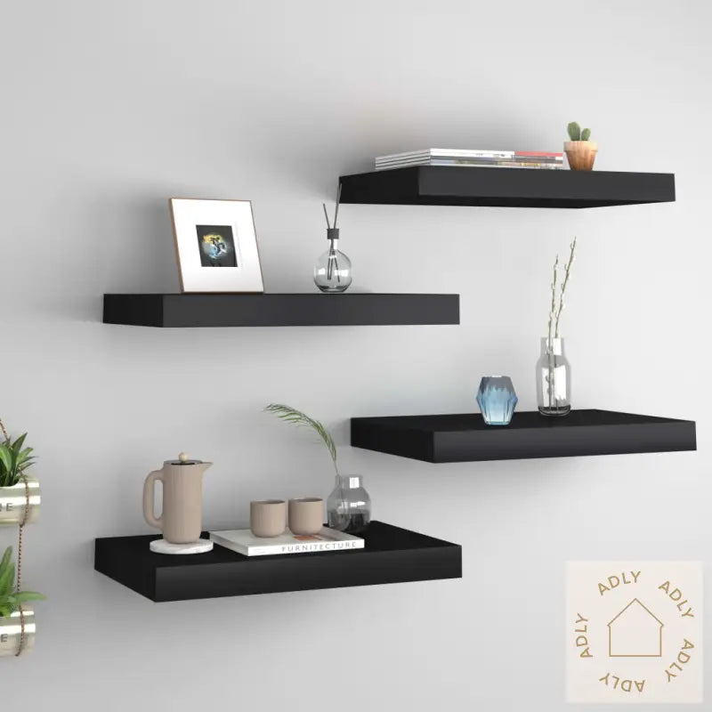 Farge: svartMaterialer: bikake MDF, metallMål: 40 x 23 x 3,8 cm (L x B x H)Maksimal lastekapasitet (hver): 5 kgUsynlig monteringssystem gjør installasjonen enkel og bidrar til et flott helhetsinntrykkMontering kreves: jaLeveransen inneholder:4 x vegghyller