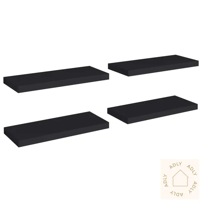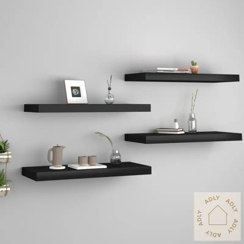 Farge: svartMaterialer: bikake MDF, metallMål: 60 x 23,5 x 3,8 cm (L x B x H)Maksimal lastekapasitet (hver): 7 kgUsynlig monteringssystemMontering kreves: jaLeveransen inneholder:4 x vegghyller