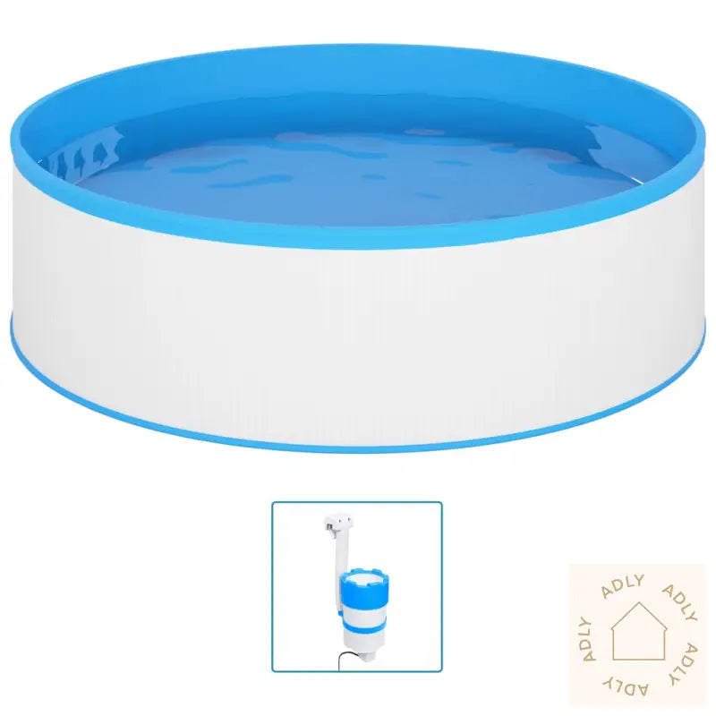 Plaskebasseng:Farger: hvit og blåMaterialer: stål og PVCMål: 350 x 90 cm (Diameter x H)Tykkelse stålvegg: 0,3 mmTykkelse PVC-foring: 0,3 mmKapasitet: 7200 L (1900 gal)Lett å sette opp og ta nedOverflaterenser med pumpeFarger: hvit og blåMateriale: plastSamlet mål: 16 x 37 cm (Diameter x H)Kapasitet filter: 2,8 LStrømningshastighet pumpe: 1700 L/tStrøm: 12 V, 20 W (med 230 V transformator)Egnet for frittstående bassengerMontering kreves: jaLeveransen inneholder:1 x plaskebasseng1x overflaterenser med pumpe