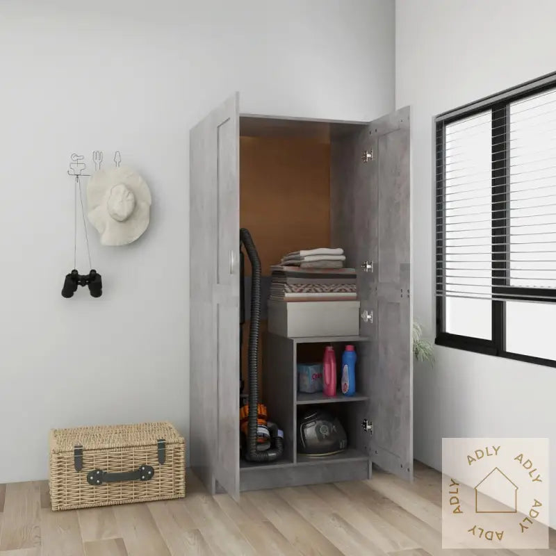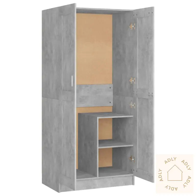 Farge: betonggråMateriale: konstruert treMål: 82,5 x 51,5 x 180 cm (L x B x H)Montering kreves: jaADVARSEL: For å forhindre at produktet velter, må medfølgende festemidler for vegg benyttes