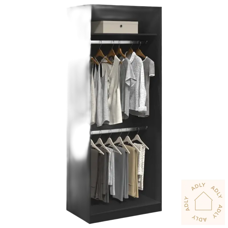 Solid og holdbart materiale: Garderoben er laget av konstruert treverk, kjent for sin høye kvalitet og glatte overflate. Dette gir ikke bare styrke og stabilitet, men sørger også for at skapet tåler daglig bruk, motstår fuktighet og holder seg pent lenge.Rikelig med oppbevaringsplass: Med to rom får du god plass til å organisere klær, luer, hansker og andre småting du vil ha lett tilgjengelig i gangen eller soverommet. Det gjør det lettere å holde orden, og alt har sin faste plass.Stilig og kompakt design: Enkelt og minimalistisk design med rette linjer gjør at denne garderoben passer sømløst inn i de fleste hjem, selv der plassen er litt begrenset. Den svarte fargen gir et moderne uttrykk og passer flott sammen med både hagemøbler og andre møbler til hjemmet.Advarsel: