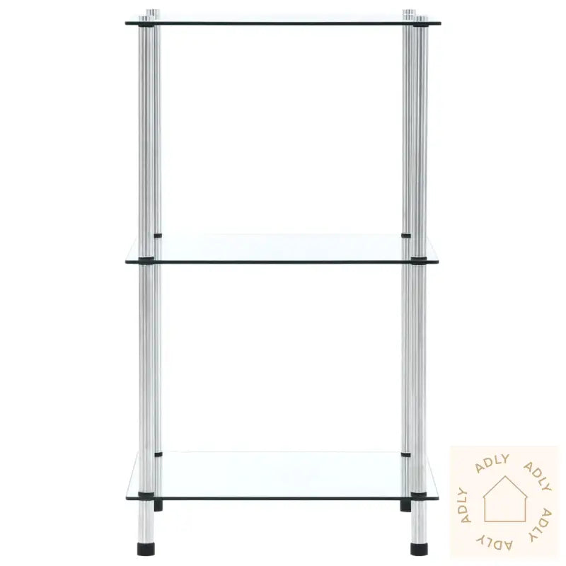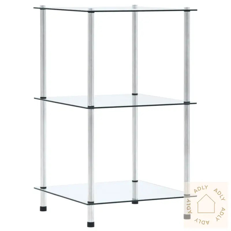 Farge: gjennomsiktigMaterialer: herdet glass + ramme i rustfritt stålMål: 40 x 40 x 67 cm (L x B x H)Tykkelse glass: 5 mmMed tre etasjerADVARSEL: For å forhindre at produktet velter, må medfølgende festemidler for vegg brukes.